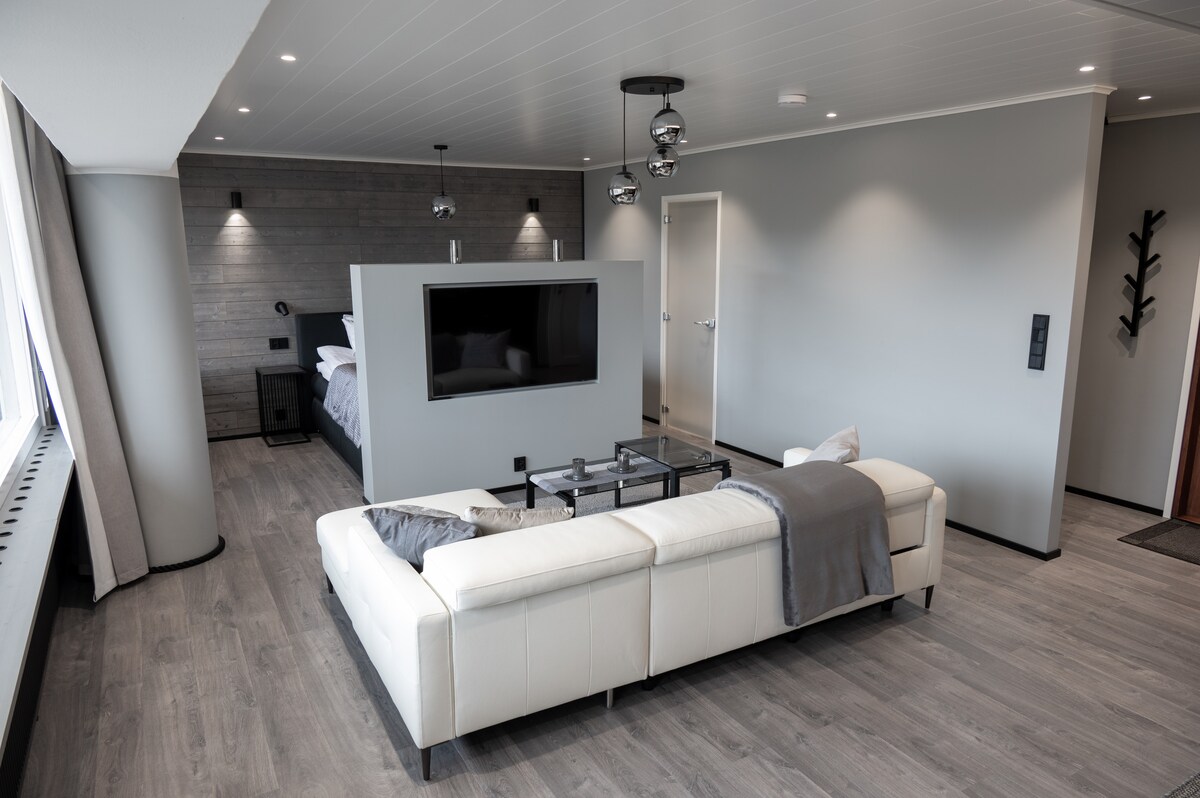 Valgusküllane ühe magamistoaga korter, mille keskel on meremaastik