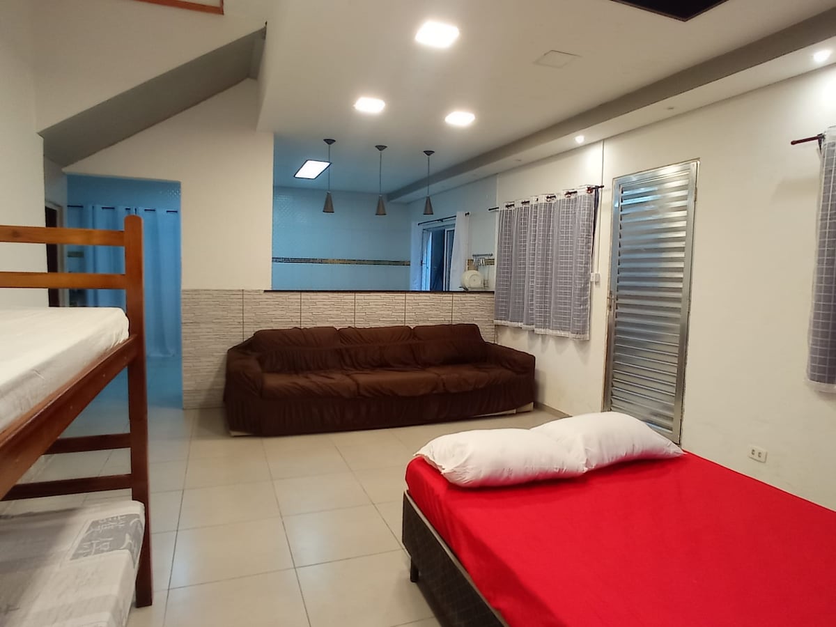 Perekondlik keskkond vaikses piirkonnas Guarujá majutuskohas 6 inimesele vaba aja veetmise alal, esnuk, fobolim, grillige ilus 6-meetrine bassein 1 magamistuba kaheinimesevoodi ja belliche 'iga, võrkkiik, täisköök, ventilaatorid kahes toas, kliimaseade , 1 kogu vannituba majas ja WC väljaspool maja.