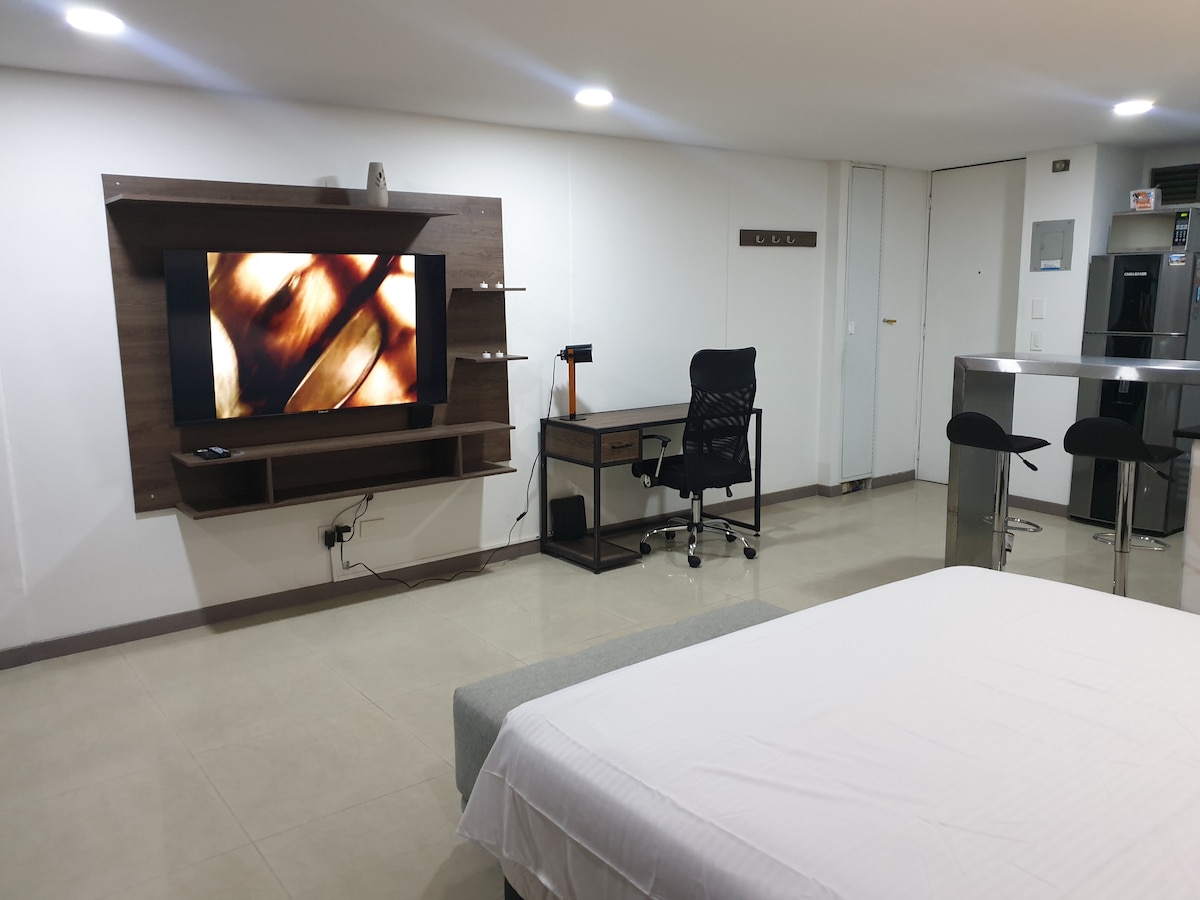 Book a stylish experience at this exclusive open plan studio near parque Lleras! - INCLUDED WITH THIS SPACE - - Dedicated work space with high speed WiFi - Private jacuzzi - Air Conditioning - Free on-site parking - 54" rotating smart TV - Netflix - King-sized hotel quality bed - Free on-site washer/dryer - Fully functional kitchen - Tea/coffee station - Black-out curtains - Body soap, shampoo & conditioner - Gym - Sauna - Swimming pool - On-site bars, restaurants & cafeteria - Art gallery
