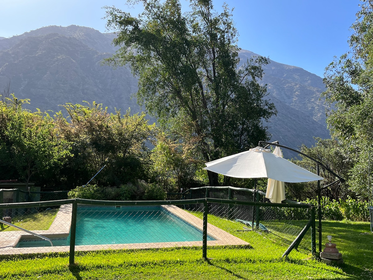 Cabaña rústica independiente en el Cajón del Maipo, rodeada de vegetación. Queda a 45 Km de Santiago (alrededor de 1 hora) y a 4 kilómetros de San José. Tiene 2 dormitorios, el principal con cama matrimonial y el segundo con cama de plaza y media, y living con estufa a leña, más futón. Cuenta con cocina-comedor full equipada, WIFI, TV Cable, terraza techada, pequeño quincho con asadera, piscina y acceso a bosque con árboles nativos, hamacas y juegos para niños. Tiene estacionamiento.