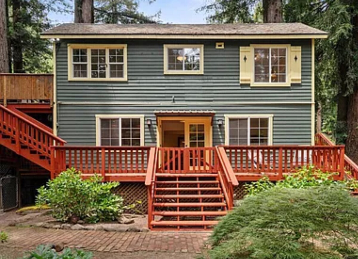 (Me ei broneeri ühtegi nädalavahetuse ööd ette, vaid paar päeva varem.) Võluv majake otse oja ääres: kas sul on koer? Teavita meid! 2 magamistuba pluss loft (pead ronima redelist pööningule), puuküttega pliit ja aknad kõikjal! Hästi varustatud köök, Roku HDTV ja Giant Redwoods kõikjal. Hiiglaslik terrass, kust avaneb vaade ojale - suur laud alfresco söögikohaks. Hinnad $ 59 - $ 375. 12% County "Hotel" Maksu kogub Airbnb.