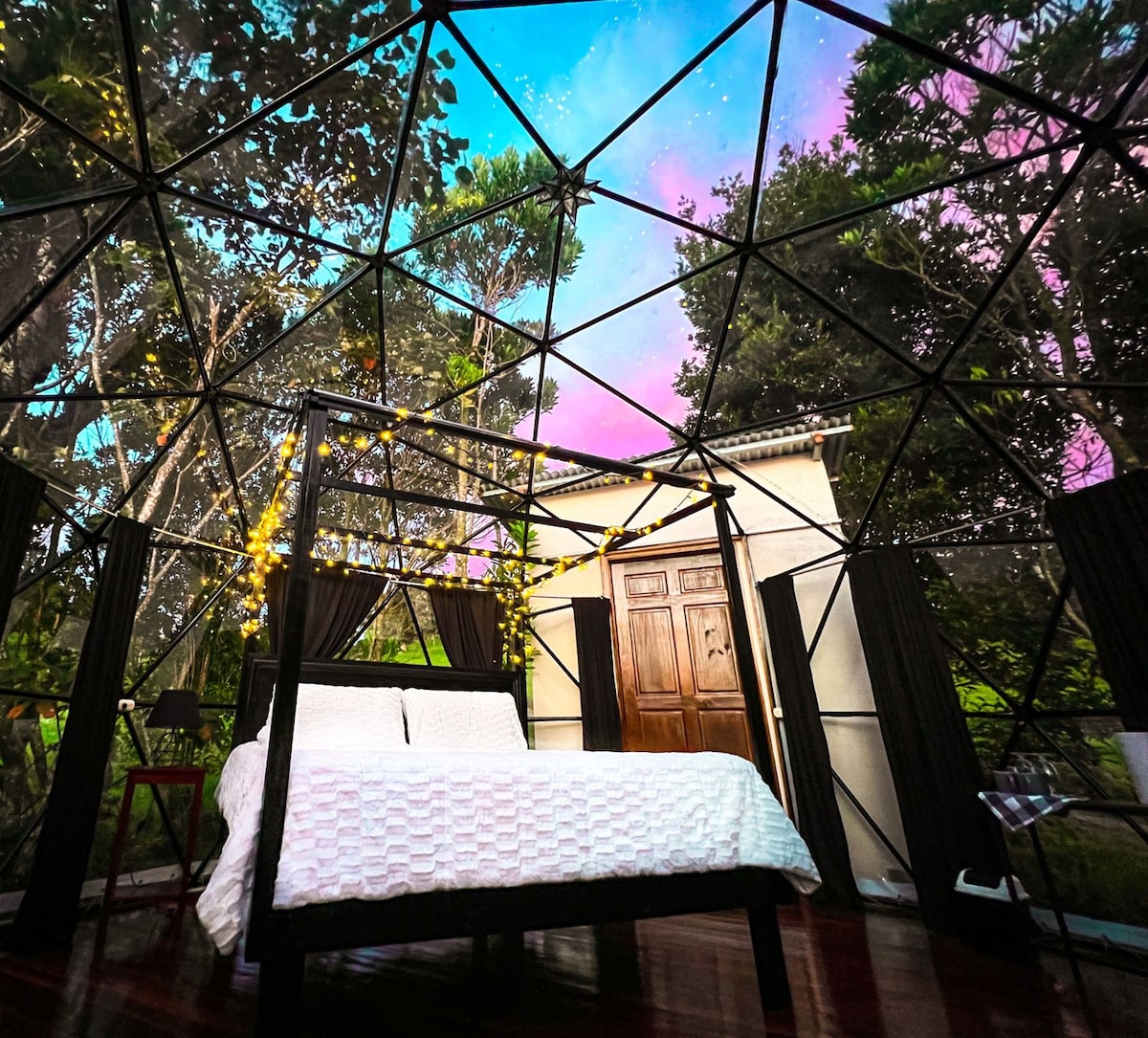 Glamping Dome, mida ümbritseb loodus ja metsloomad, kust avaneb panoraamvaade mägedele ja ookeanile. ● Piirkonnad: ☆ Parkimine ☆ Võrkkiikide piirkond ☆ Väike bassein puude all. ☆ 1. korruse terrass köögi, vannitoa ja kuppeliga Panoraamvaatega ☆ 2. korruse terrass ● Descripción: Täielikult varustatud köök väligrilliga, vannituba vihmaduši ja sooja veega, konditsioneeriga tuba, väike bassein puude all, võrkkiikidega ala lõõgastumiseks, panoraamvaatega terrass, WIFI, privaatne parkimine ja turvakaamerad.
