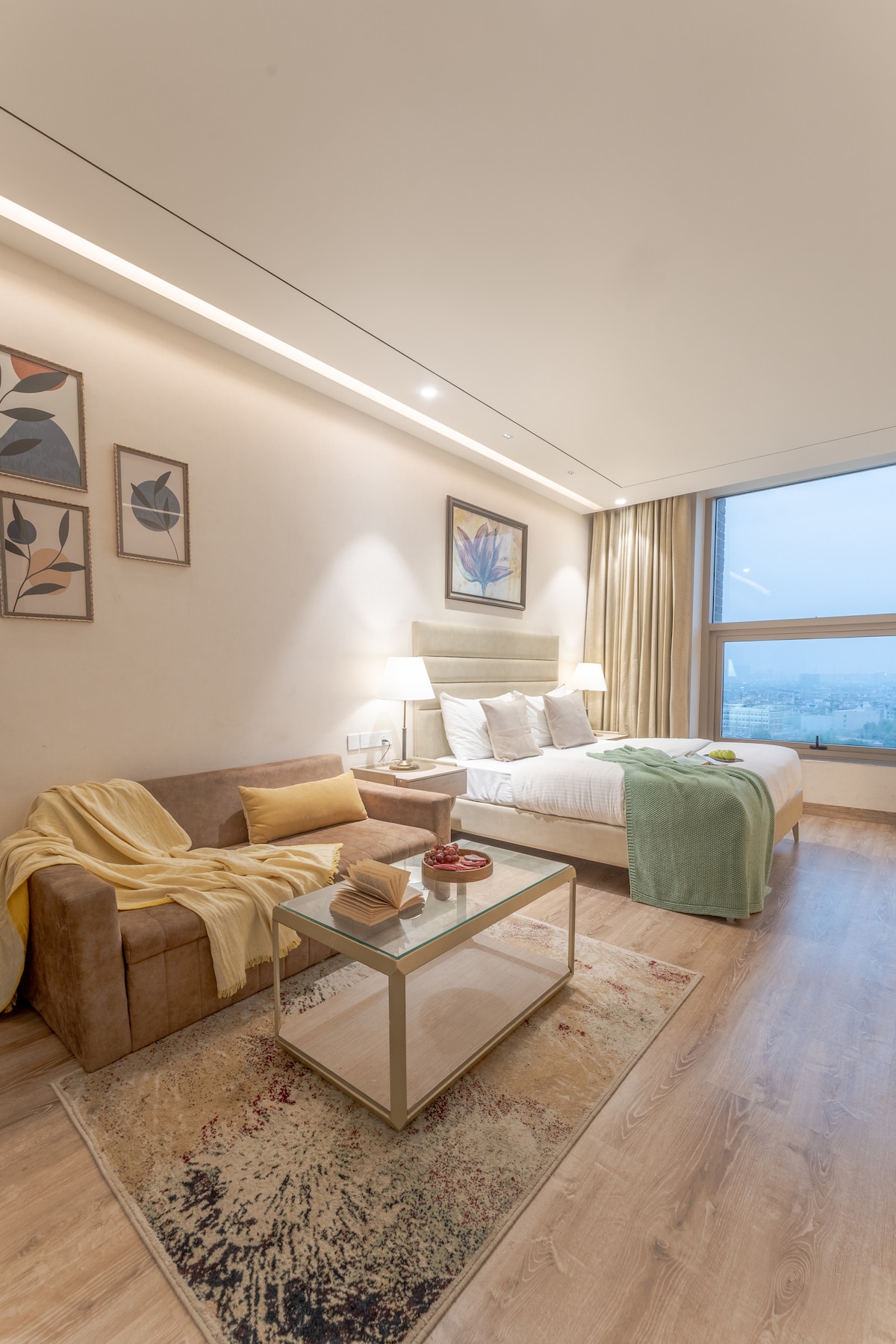 Welcome to Bridgerton, a bright studio at AIPL Joy Street in Gurgaon. You’ll have Room Controlled Central AC, fast Wi‑Fi and a large smart TV with all the OTT streaming apps. The kitchen comes with a fridge, microwave, fine cutlery, chic dishware, and premium linens for bed and bath. When you step outside you’ll have INOX theater, Sodhi’s Market, Blue Tokai, Poiz and Café Delhi Heights and many other premium cafés on ground floor of the building. Perfect for work trips or weekend getaways.