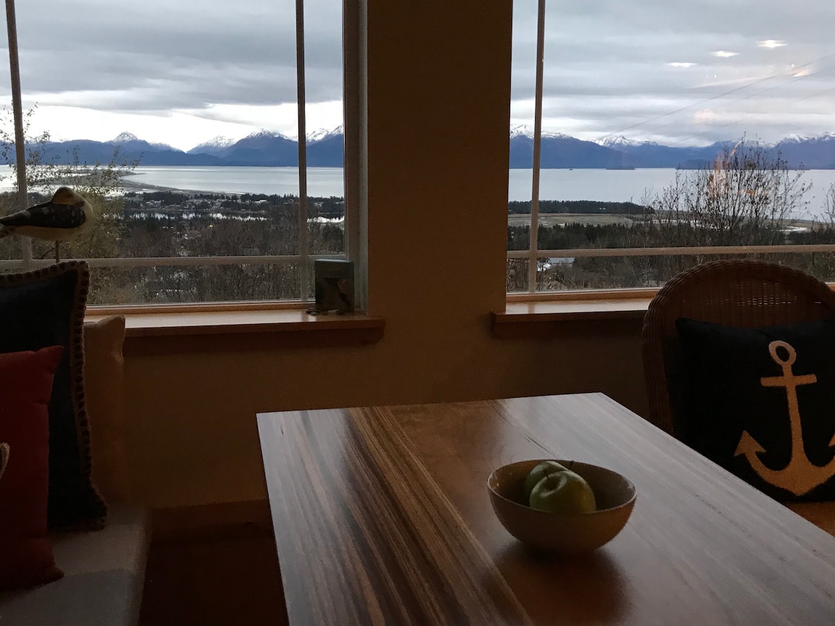 Conveniently located just two miles from town, a charming cabin with stunning view of Kachemak Bay, the glaciers and surrounding mountains. Bright, open, custom construction. A place to relax and commune with nature. Chosen by Airbnb as “most hospitable host for 2021 for Alaska”. This is a no-pet listing. I would love to host you in my cabin! Send me a message with any questions you may have.