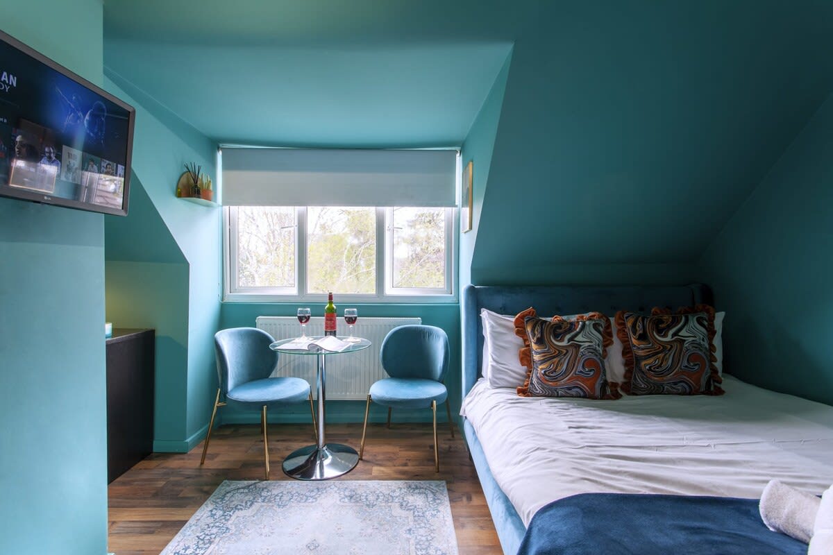 Julge, sinine, boheemlaste stuudio Londonis - mahutab 4 inimest