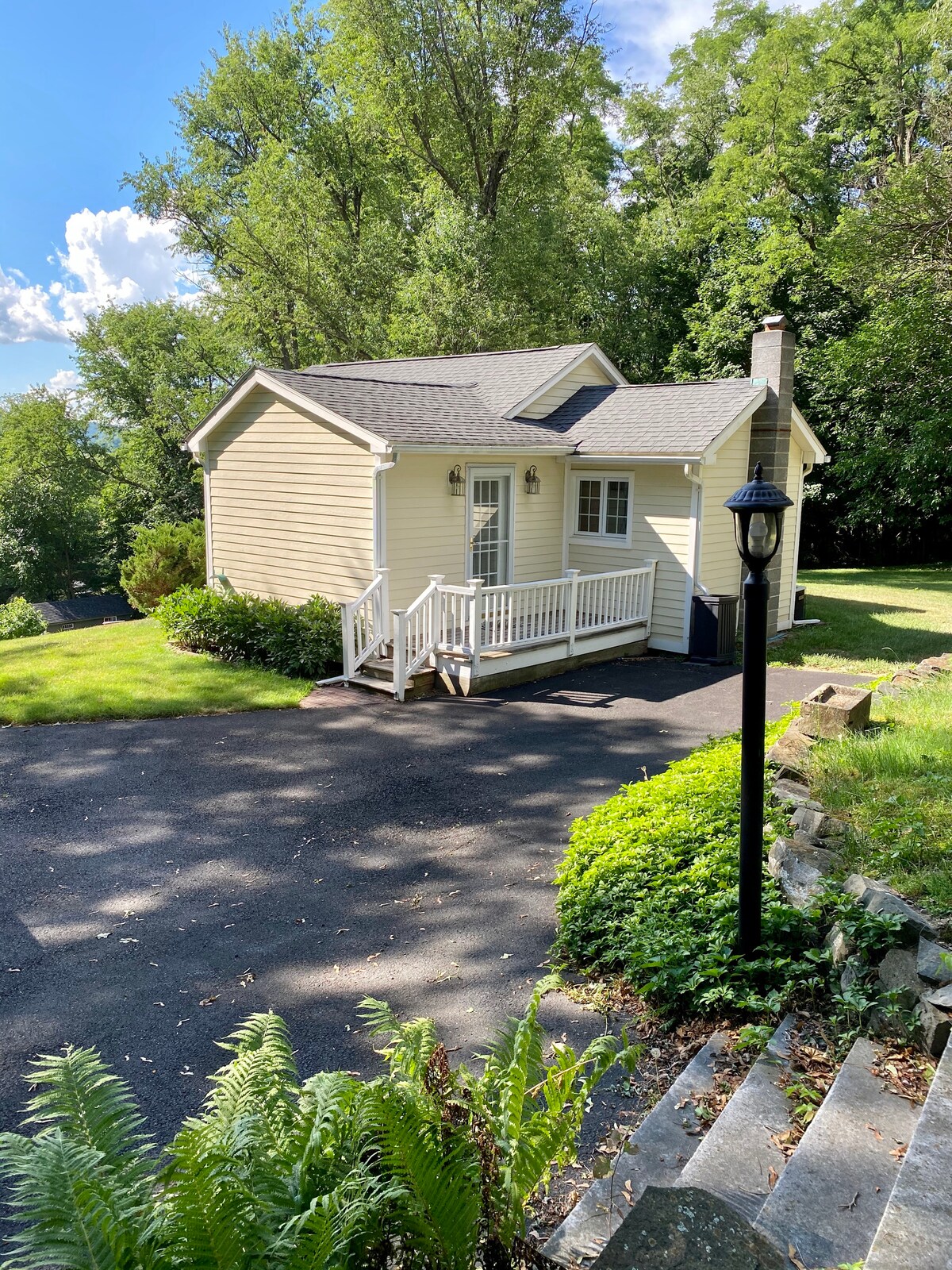 1 bedroom 1930's guest cottage with a living room. Near many hiking trails. Window air conditioner brand new, ceiling fans in living room and bedroom. Separate windowed bedroom with new full size mattress. Full size gas stove, microwave, fridge, Keurig coffee maker, toaster and large tiled counter and sink. Full bath off bedroom with large clawfoot tub and shower combination and sink and brand new toilet. Wifi , flat screen Smart TV. Vintage cast iron fireplace with electric insert.