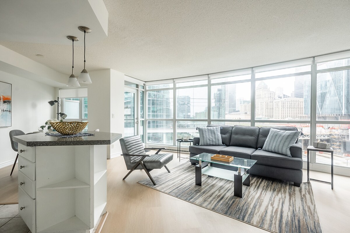 Experience downtown Toronto in a stylish condo! Start your day by enjoying coffee on the balcony. Walk to BMO Field (Toronto Stadium) - ideal for concerts, sports & FIFA events. Walk to CN Tower, Rogers Centre, Ripley’s Aquarium, Exhibition Place, restaurants & waterfront. Full kitchen, 2 desks with fast WIFI. Building features a pool, hot tub, sauna, gym, rooftop BBQ, free parking & self check-in. Discounts for 7+ nights & non-refundable bookings. Book your unforgettable Toronto stay today!