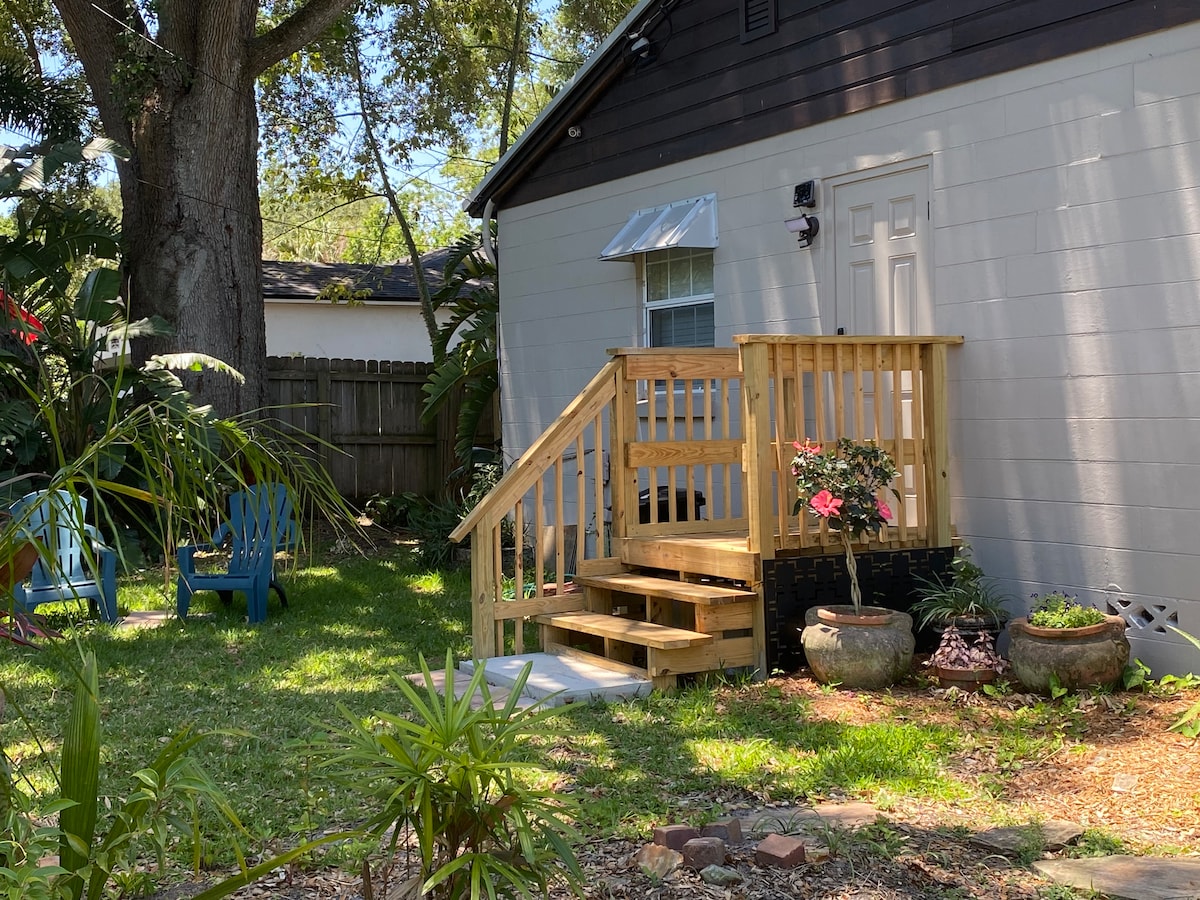 Vaiksel munakivitänaval, kuid kunsti ja kultuuri lähedal, rohkem kui kolm tosin restorani jalutuskäigu kaugusel, Florida haigla ja peresõbralikud tegevused. Sa hakkad meie majutuskohta armastama asukoha, suure mullivanniga vannitoa, katuseakende, aknaistme, veranda kiige tõttu. See asub meie tagahoovis, mida ümbritsevad puud, ja sellel on oma isiklik sissepääs maalähedase kõnnitee ja kividega. Paarid, pered ja enamik inimesi peab seda võluvaks. STR 1009942 (linna registreerimine)