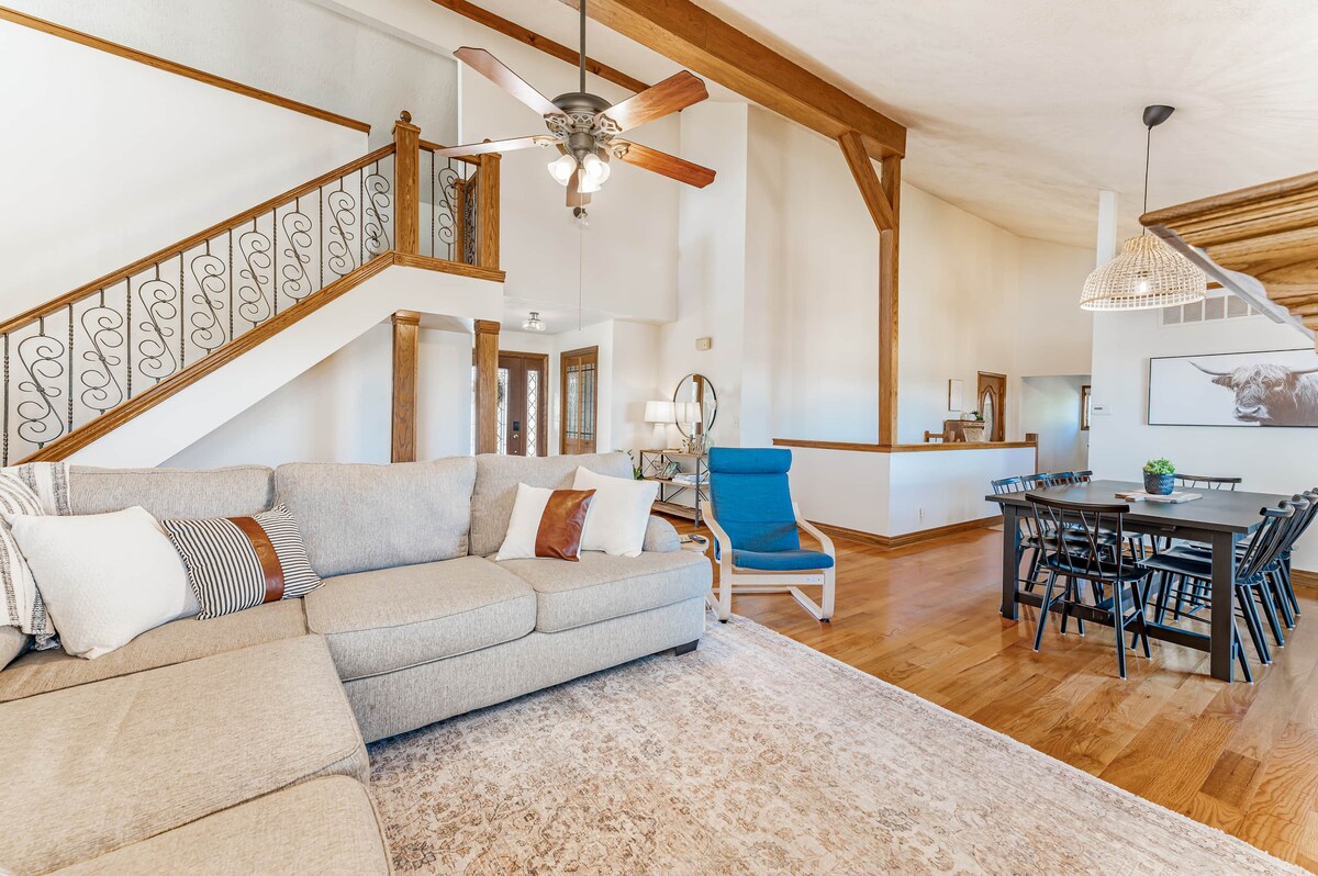 Tere tulemast Sunrise Ranchile! Miski ei ületa Kansase maapiirkonna võlu ja rahu. See on üks meie suurimaid rõõmu, mis võimaldab teistel kogeda varjupaika ja rahulikkust, mida riik pakub. Olenemata sellest, kas sul on vaja vaigistada elu, koguneda koos sõprade/perega puhkamiseks või pidutsemiseks või mugavalt viibida meie lähedalasuvas pulmakohas, on meil au jagada sinuga Sunrise Ranchi. See on meie suurim eesmärk, et tunneksid end mugavalt ja sinu eest hoolitsetakse. Me oleme 30-minutilise autosõidu kaugusel Wichitast ja 8 miili kaugusel Newtonist hõlpsasti sillutatud teest. Oleme peidetud teelt kõrvale, et nautida privaatset ja rahulikku kogemust. See on kõige täiuslikum, lõõgastav, maapiirkond. Nagu John Denver ütleb: „Maateed, vii mind koju“, loodame ka, et need maanteed viivad sind kohta, mis tundub kodune. Majutuskoht Ostsime selle majutuskoha, sest see asub meie pulmakohas. Kuid mitte ainult ei tulnud kohale ideaalse 3-minutilise autosõiduga, vaid seda ei oleks saanud täiuslikumalt üles seada. Me kujutasime ette peresid ja sõprade rühmi, kes saavad levida kõigile kolmele tasandile - peamisele korrusele, kogu keldrisse JA pööningule ning ilusale tagakorrusele. Rantšos on Master King Suite ja veel neli magamistuba, kus kõigis on kaheinimesevoodi JA lisavooditega loft, mis sobivad ideaalselt lastele või lisakülalistele. Master-sviidis on privaatne vannituba koos kahe teise vannitoaga, üks igal korrusel. Rantšos on ka kaks elutuba, üks ülakorrusel ja üks allkorrusel, pesuruum, täisköök, söögituba ja 3 auto garaaž. Ülakorruse elutoas on nutiteler, allkorruse keldris ja allkorruse kuninga magamistoas. Saad kasutada oma lemmikvoogedastusteenuse (Amazon Prime, Disney Plus, Netflix, Hulu) sisselogimise üksikasju. Ära unusta kassas välja logida. Kuigi me teame, et naudid selle maamaja sisemust, on see väliskülg, mis võib sulle rohkem tagasi tulla. Naudi hommikukohvi ja kaunist päikesetõusu või õhtusööki tagakorrusel või kamina ümber. Korista oma ööd mullivannis suure tähistaeva all. Loodame, et tunned end nagu kodus vannitubades sisalduvate mugavustega: saadaval on põhilised tualett-tarbed, voodipesu, föön jne. Meie pesuruumis on ka kõik, mida vajad - pesumasin, kuivati, puhastusvahend, triikimislaud, triikraud jne. Me arvame, et leiad köögi täis kõike vajalikku ja palju muud! Me teame, et mõned teist veedavad siin pühi, nii et oleme veendunud, et köögis on mõned neist majutamisvajadustest. Kas vajad natuke trenni, kuni sa oma peatumist naudid? Sissesõidutee on pool miili pikkune ning turvaline ja rahulik jalutuskäik või sörkimine. Pead lõõgastuma suure tähistaeva all, meie kümblustünn on ideaalne maiuspala. Kas oled huvitatud grillimisest? Meil on tagakorrusel gaasigrill kasutamiseks saadaval. Meil on ka grillimistööriistad! Külaliste juurdepääs: Sunrise Ranch on ligipääsetav jagatud sissesõiduteel. Sissesõidutee sissepääs asub peamisest sillutatud teest, mis tuleb otse itta Newtonist - First Streetist. Ja meie 7 aakrit asub tagasi maapiirkonnas. Kui näed ikoonilist valget talu tara, oled leidnud oma tee. Sa möödud teisest elukohast paremal ja jätkad Y-ist ja jätkad, kuni sissesõidutee viib sind mööda valget tara ja otse Sunrise Ranchi. Siin on palju ruumi, kuid palume paluda mitte ühtegi tara ületada, et teiste majutuskohast eemal püsida. Muud asjad, mida tähele panna: 1. Keldri magamistoad/vannitoad ei sobi suurepäraselt külalistele, kes on ehitaja huvitava disaini tõttu või kõrgemad külalistele. Nii et saada oma lühemad inimesed allkorrusel! 2. Me ei luba lemmikloomi Sunrise Ranchis. Me armastame oma lemmikloomi ja me teame, et ka sina jumaldad oma, kuid me oleme kindlad oma põhimõtete „Lemmikloomad keelatud“ suhtes kehtivad kindlad, et hoiame tulevasi allergiaga külalisi turvaliselt, samuti meie majutuskohas. Võime entusiastlikult soovitada retriiverit imeliseks kohaks koerte pardale minekuks! Need asuvad meie lähedal, vähem kui 10 minuti kaugusel rantšost! 4. Rantšo on täiesti mittesuitsetamine. Palume, et kui suitsetad väljaspool maamaja, viskaksid prügi korralikult ära, mitte kuhugi meie territooriumil. 5. Me palume, et meie külaline ei toimu suuri kogunemisi ega pidusid. Mis on meie ümber: Kui broneerid rantšo, mis on Newtonist vähem kui 10 minutit, leiad, et see on: *8,5 miili kaugusel I-135-st, nii et ideaalne peatus kõigile, kes reisivad Kansase kaudu. *10-15 miili kõigist suurematest tööandjatest, Bethel College 'ist, restoranidest ja koolidest Newtonis *Umbes 10 minutit Walmartini ja Dillonsini *Umbes 1 miil Harvey Country East Parkini (järv!) *Umbes 25 minutit East Wichitani (East Lake Rd/Greenwich Rd kaudu) - Chic-fil-a, Chipotle, Target, Starbucks, Top Golf (varsti) ja palju muud. *Umbes 30 minutit Wichita kesklinnani * TransAmericu jalgrattarada kulgeb mööda sissesõidutee lõppu
