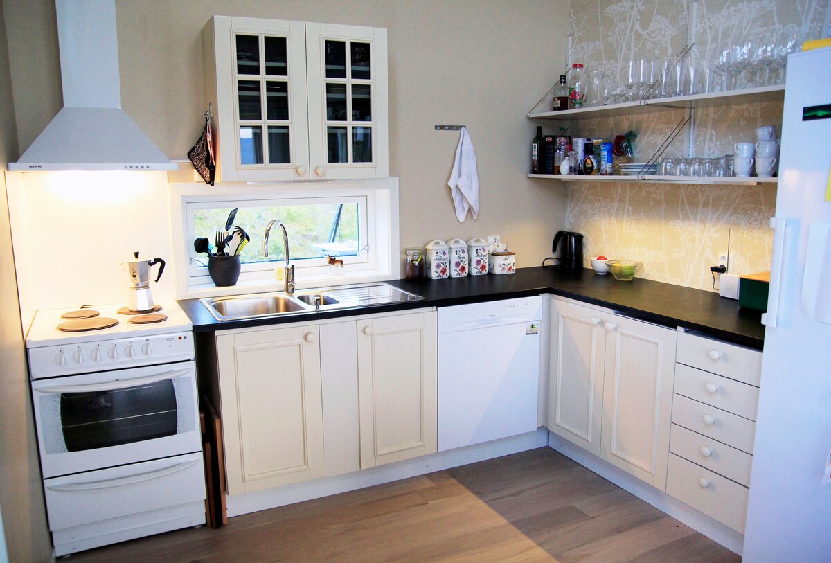 100 m E10-st. Väike korter eraldi hoones kööginurgaga, väike dušš, wc, elutuba, 2 väikest magamistuba. Rõdu, suurepärane vaade. Ühe tunni autosõidu kaugusel Evenes lennujaamast, asume keskselt Lofoten ja Vesteråleni vahel. Lennujaamabuss ++ "ukse juurde". 2 inimest, 1 üheinimesevoodi (90x190 cm) ja 1 väike kaheinimesevoodi (120x190 cm). Elutoas diivanvoodi. Väike, kuid hästi varustatud köök pliidi, külmiku, kohvimasina, mikrolaineahju jms-ga. TV, WiFi. Voodipesu ja rätikud on olemas. Pesumasin ja kuivati olemas