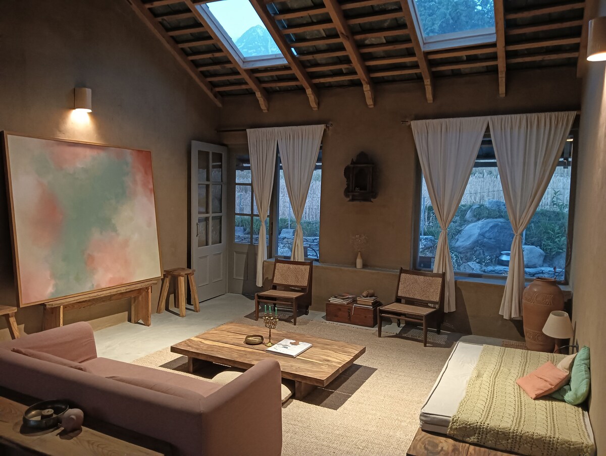 Maalähedase vintage-tunnetusega hubane savimaja. Koht, kus saab kogeda avastamist, loodusega taasühinemist ja aeglast teadlikku elu. Meie maja asub mäe tipus Jibhi orus ja tiheda Deodari metsa vahel, kust avaneb panoraamvaade Pir-Panjalile ja Dhauladhari mäeahelikule. Ilus maastik, mis muutub iga mööduva hooaja jooksul. Meie maamaja asub LUSHALi omapärases külas ja on eemal peavooluturismi rahvamassist ja saginast.