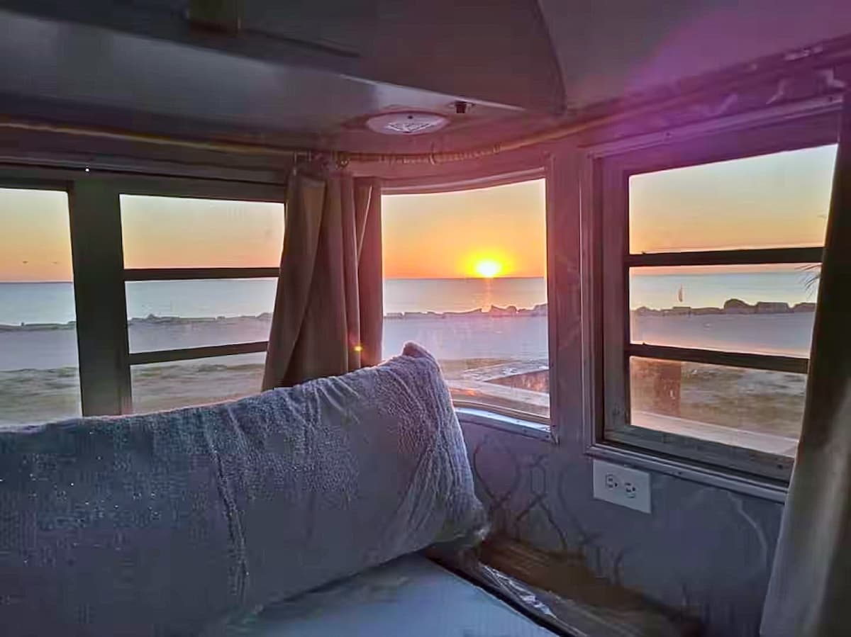 Vanaaegne matkaauto vee ääres • Päikesetõus ja juurdepääs kai äärde
