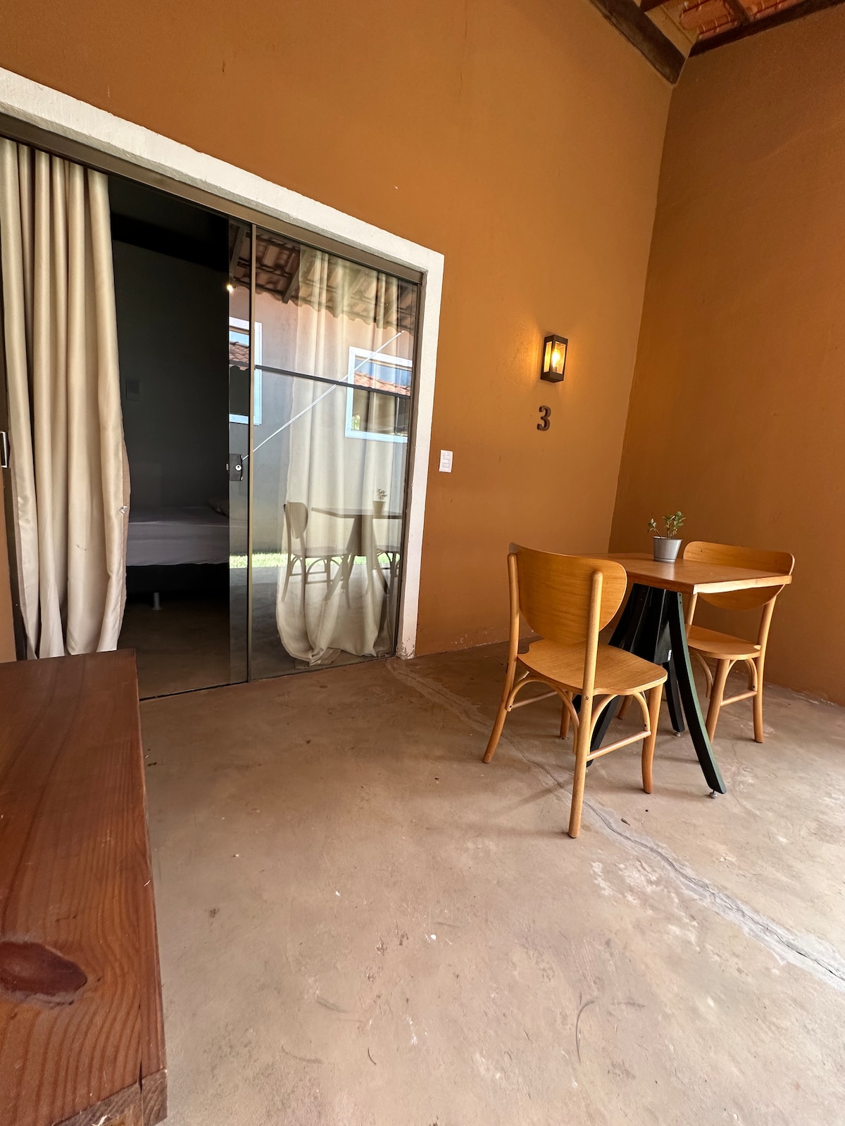 Bangalô com suíte aconchegante com teto e piso de madeira, ar condicionado, banheiro confortável com água quente de aquecedor solar; varanda com mesinha e rede; quiosque com geladeira , churrasqueira, fogão elétrico, pia e mesa, toda equipada para fazer suas refeições; ducha e espreguiçadeira! Gostamos de compartilhar a vida tranquila e aconchegante do campo com pessoas que são amantes da natureza e vêm para descansar em local seguro e familiar, pois somos um casal que mora no sítio.