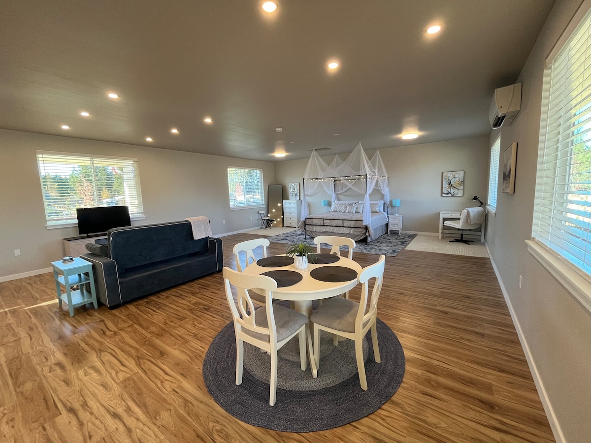 See 400 ruutjalga stuudiokorter on valgusküllane ja armas, vaid mõne minuti kaugusel Port Angelese kesklinnast vaikses elurajoonis. Meil on külaliste jaoks elektriautode laadija (J1772 pistik). Magamisalal on lai kaheinimesevoodi. Seal on kööginurk, kus on külmik, mikrolaineahi, kohv ja röster (ilma pliidita). Olemas on täielik vannituba ja istumisnurk. Päikesepaisteline terrass ja aia kümblustünn on suurepärased lisad.