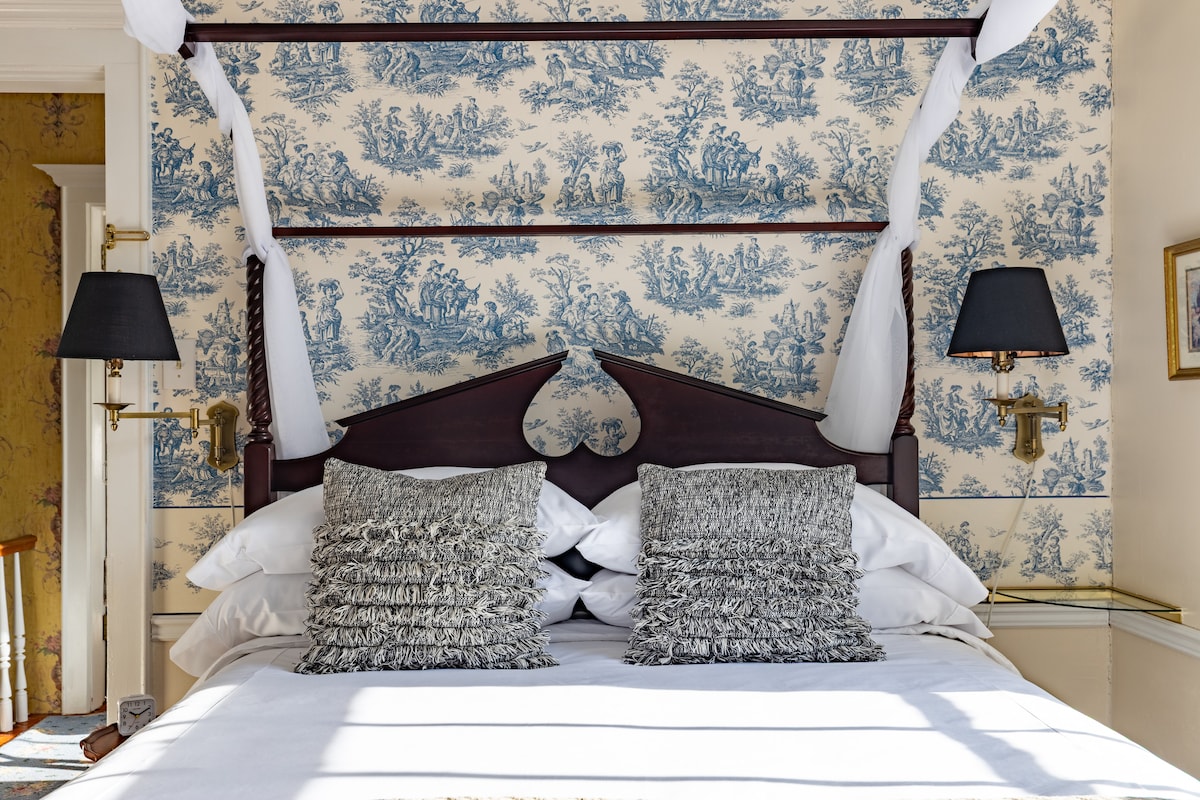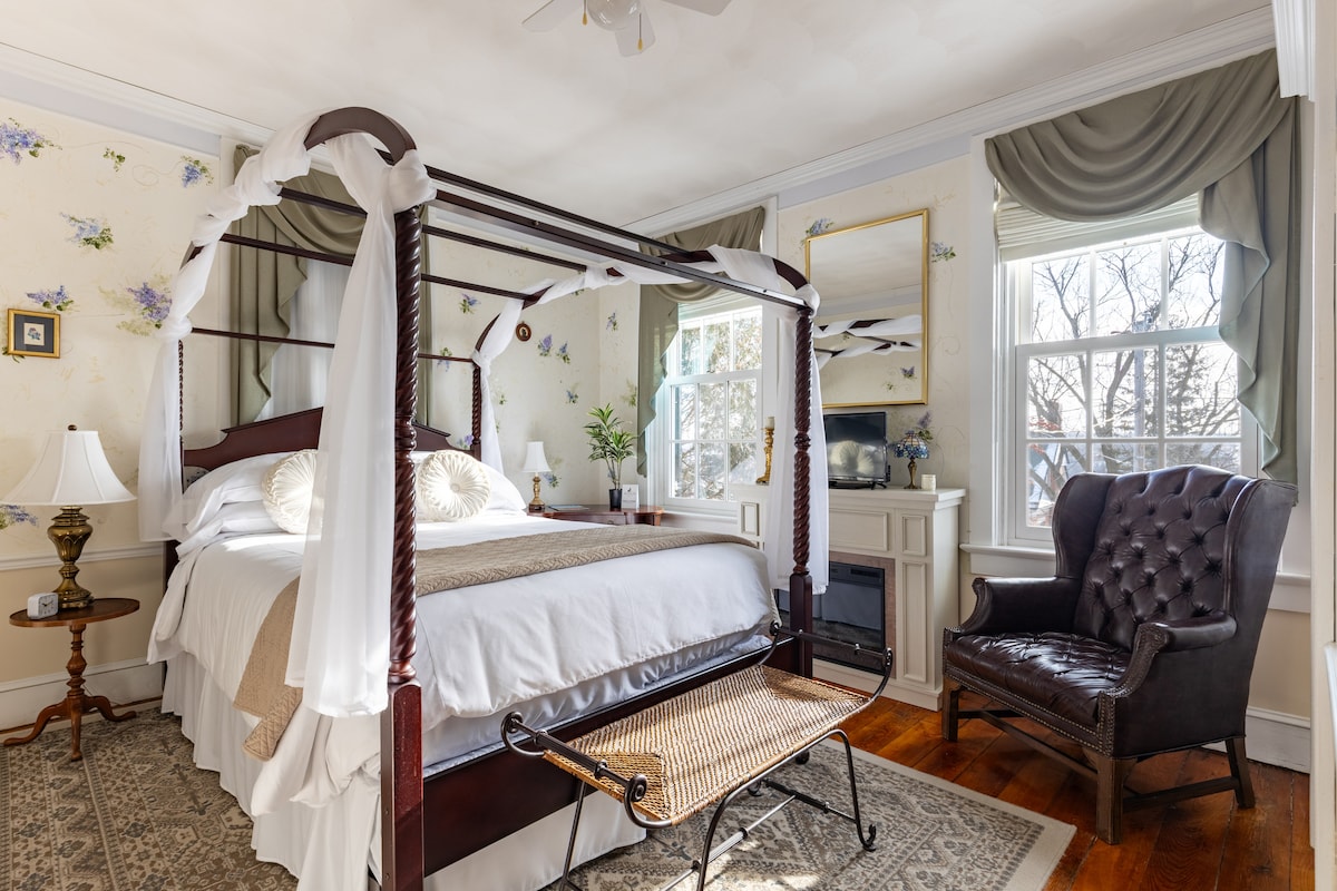 Welcome to the Painted Cat of Galena, a cozy Victorian B&B with feline flair! In the Calico Room, you'll experience moody luxury in a cozy, intimate setting. Featuring dark floral wallpaper and embroidered curtains, this room is perfect for a romantic getaway. You'll also find a spacious bathroom with a large jetted soaking tub (no shower). Includes a Roku HDTV, window AC unit , steam heat. Daily breakfast included with your stay! We proudly welcome cat lovers of all stripes 🏳️🌈🏳️⚧️