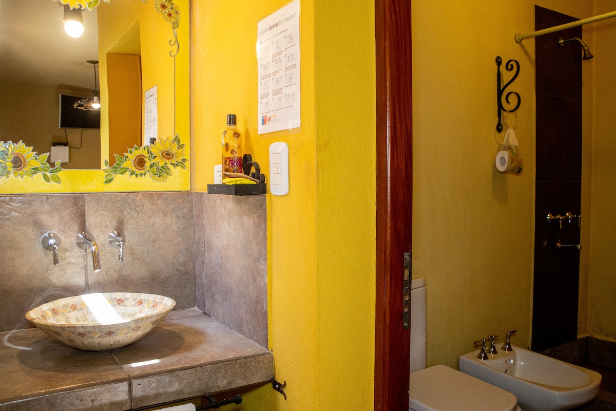 ¡Habitación privada tipo apart-hotel en pleno centro de Jujuy! Disfrutá la comodidad de tener tu baño privado, A/C y kitchenette equipada (frigobar, pava eléct., vajilla). La hab. tiene TV, ropa de cama y toallas. Incluye limpieza diaria. ¡Contamos con estacionamiento privado (autos/camionetas)! Ubicación ideal a 500mts: caminá a Plaza Belgrano y Parque Xibi Xibi. **Importante: El servicio no incluye desayuno.**