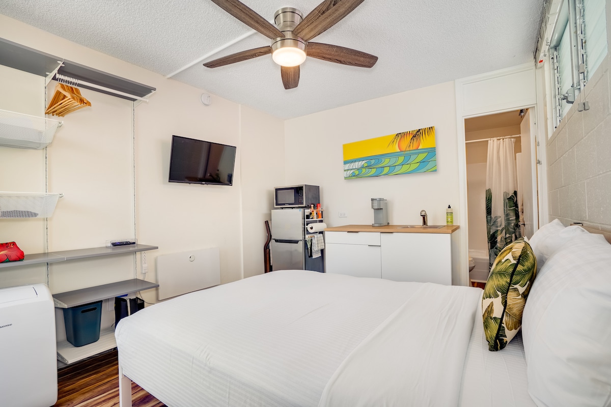 Väike ja hubane korter 236 ruutjalga See asub Waikiki alguses ja on umbes 10-minutilise jalutuskäigu kaugusel rannast ja Waikiki südamest. Üle silla on konverentsikeskus ja 15-minutilise jalutuskäigu kaugusel Ala Moana kaubanduskeskusest. Stuudio on täielikult sisustatud - lai kaheinimesevoodi,televiisor, wifi, täisvann, kohvimasin, induktsioonkütteplaat. Hoones on pesumaja, bassein, mullivann ja grillimisala; lisatasu eest võid kasutada jõusaali ja parkimist.