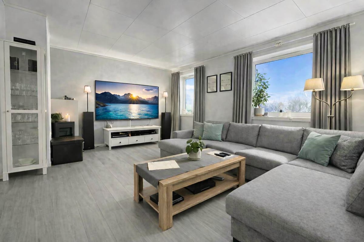 Suurepärane uus maja (2018) armas ja vaikses piirkonnas, kust avaneb kaunis vaade fjordile/merre, mägedele ja metsale Kvaløyas/Tromsøs. Saad vaadata ilusat virmalist / aurora borealist tohutust aknast (10 ruutmeetrit), istudes elutoas tass teed või kohvi käes hoides:-) See on ideaalne koht turistidele, kes soovivad näha virmalisi, vaalu fjordis talvel, matkamist/suusatamist mägedes või kõike muud, mida soovid selles armsas linnas.