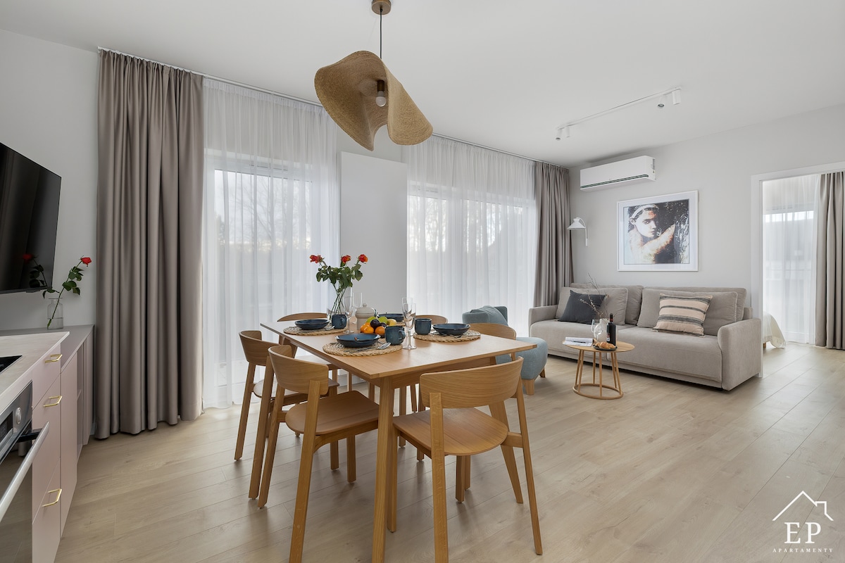 Kaasaegne korter Sea & Forest Resortis Wolini rahvuspargi piiril. Avar, täielikult varustatud, rõdu, kliimaseadme ja kööginurgaga. Külalistel on maa-aluses garaažis privaatne parkimiskoht ning juurdepääs heaolu- ja spordikuurordile. Piirkonnas on palju matka- ja jalgrattateid, umbes 1 km kaugusel Bisoni talust, 30-minutilise jalutuskäigu kaugusel merest või tasuta korterist. Ideaalne lõõgastumiseks ja aktiivseks puhkuseks.