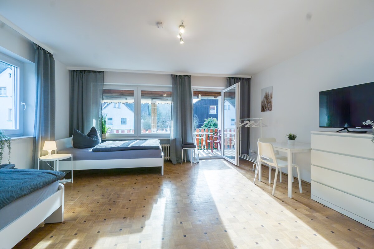 Willkommen in Ihrem hellen und ruhigen 1-Zimmer-Apartment, ideal für Ihren Aufenthalt in Kulmbach. Das Apartment verfügt über einen eigenen Balkon, auf dem Sie entspannen und die frische Luft genießen können. Lage: - Nur 15 Minuten zu Fuß bis ins Stadtzentrum. - Ein Bäcker und eine Bushaltestelle befinden sich in unmittelbarer Nähe, was Ihnen den Alltag erleichtert. **Ausstattung:** - Ein bequemes Schlafsofa, das sich einfach ausziehen lässt, um zusätzlichen Schlafplatz zu bieten.