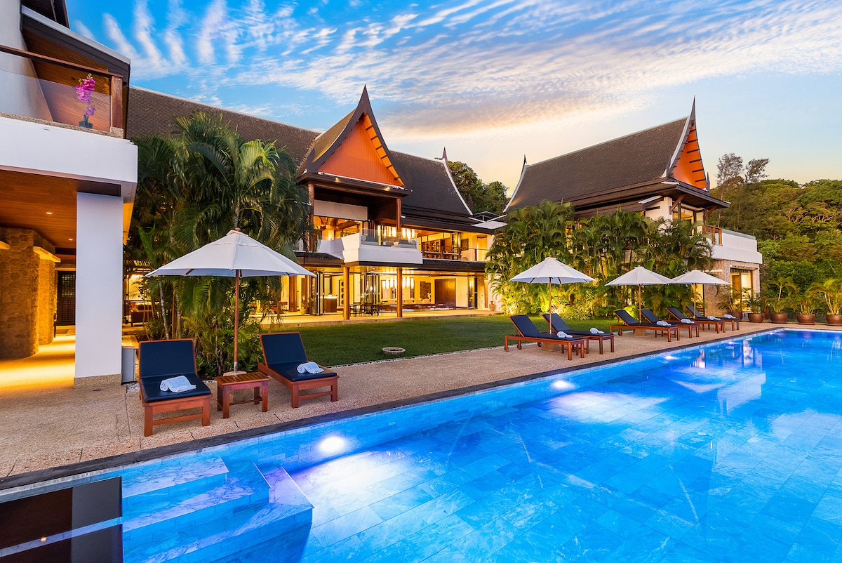 Lush headlands rise behind this trad-inspired, architect-designed Cape Amarin villa. The Andaman Sea spreads out around a pool terrace; lounging and dining areas flank a lawn. Thai-style living rooms with soaring ceilings and wall-to-wall glass are paired with a Japanese-style dining room. The beach at Kamala is 10 minutes away by car, and nightlife in Patong is a 15-minute drive. Copyright © Luxury Retreats. All rights reserved.