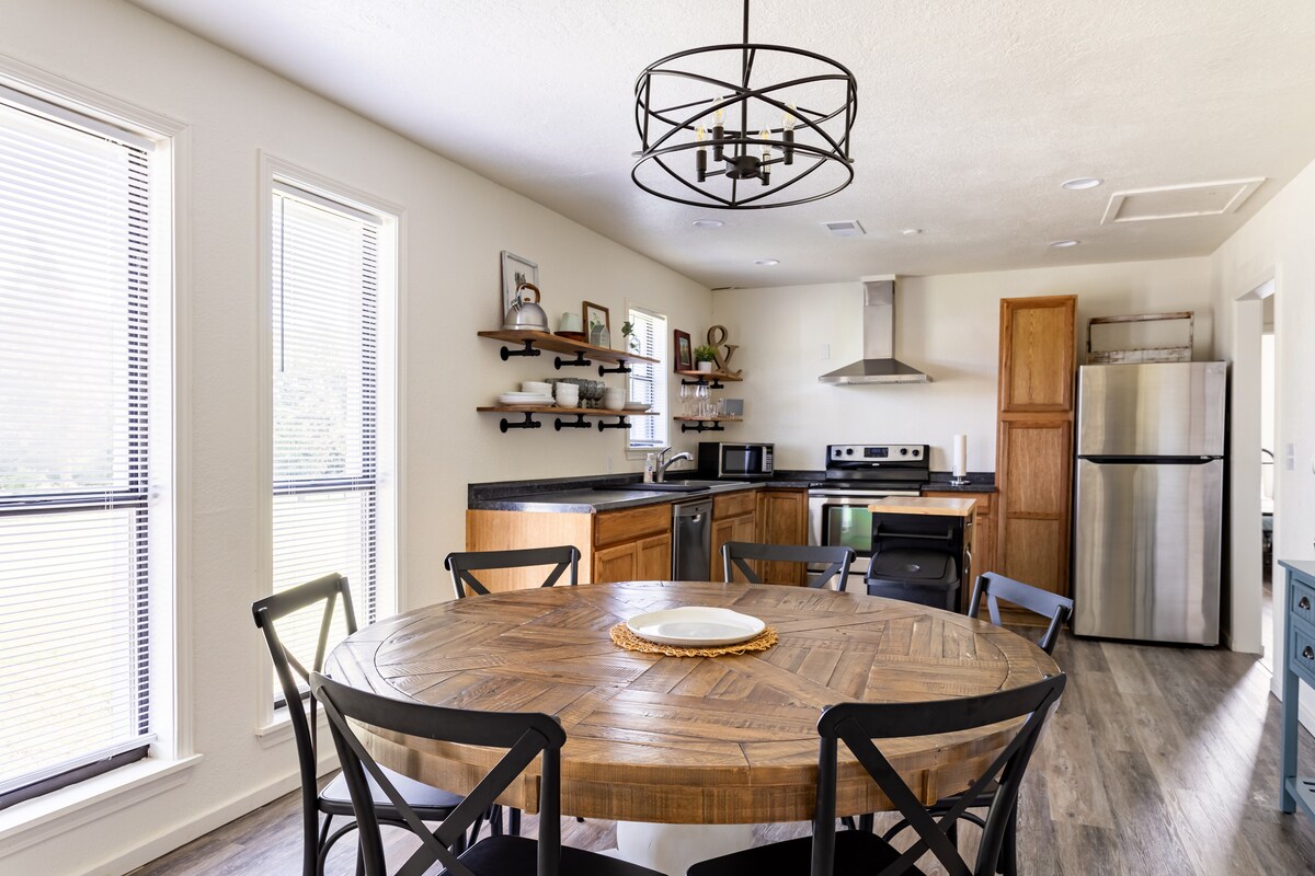 Convenient in town location. Enjoy the vaulted living room area, one bedroom, one bath villa decked out in an industrial décor, from reclaimed boxcar flooring wood countertops with steel trim to sliding barn doors. Everything you need to make your stay in Sulphur pleasant as possible at a budget friendly price. You are close to Chickasaw Recreation (Platt National Park) area, a unique downtown, arts centers and casinos as well as multiple fine restaurants.