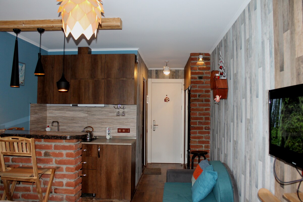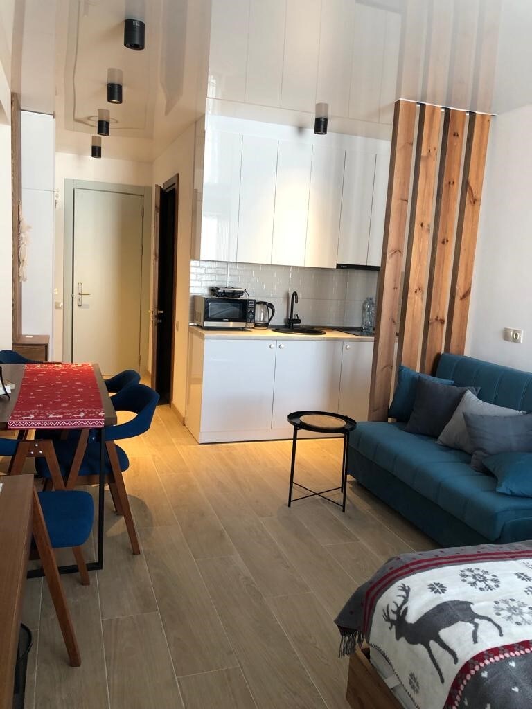 Tere tulemast stuudiosse Gudauris, Gruusias, 2200 meetri kõrgusel! Värske renoveerimine puidu ja kiviga loob hubase mägise atmosfääri. Täiuslik valgustus, funktsionaalsed ruumid - elutuba, magamistuba, panoraamakendega köök, mis annab loomulikku valgust. Päikesepaisteline külg pakub rabavaid vaateid mägedele. Suusatõstuki, poodide ja restoranide lähedal - ideaalne suusapuhkuseks. See stuudio ühendab stiili, mugavuse ja funktsionaalsuse unustamatuks puhkuseks.