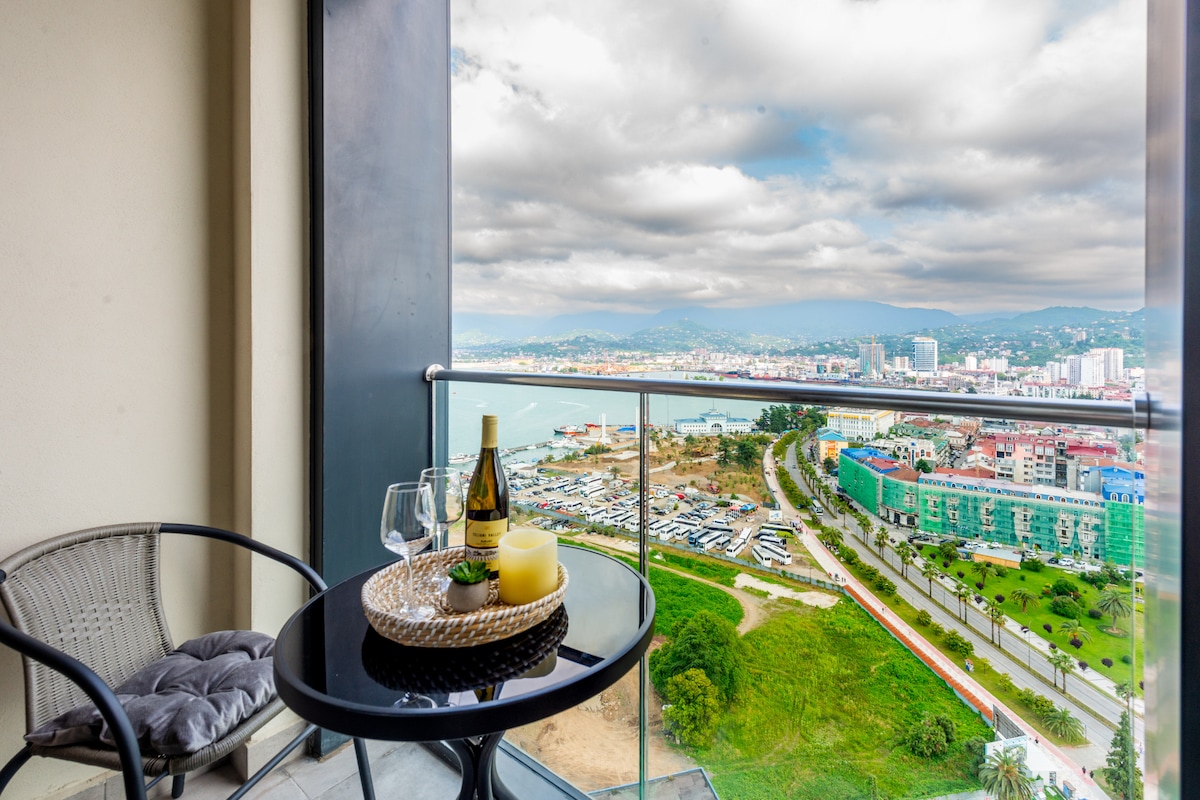 180-kraadise panoraamvaatega Batumi korter. Võid kohtuda päikesetõusuga oma magamistoast hommikul ja päikeseloojangul õhtul. Rõdult avaneb stiilne vaade Arena Batumi jalgpalli staadionile. Poed asuvad 30 meetri kaugusel (supermarket. apotheka jne). Meri mõne minuti jalutuskäigu kaugusel. 180-kraadise Batumi panoraamvaatega korter. Rõdult avaneb suurepärane vaade Batumi Arena jalgpallistaadionile. Ostukeskus on 30 meetri kaugusel (supermarket, apteek jne). Meri on jalgsi viie minuti kaugusel.