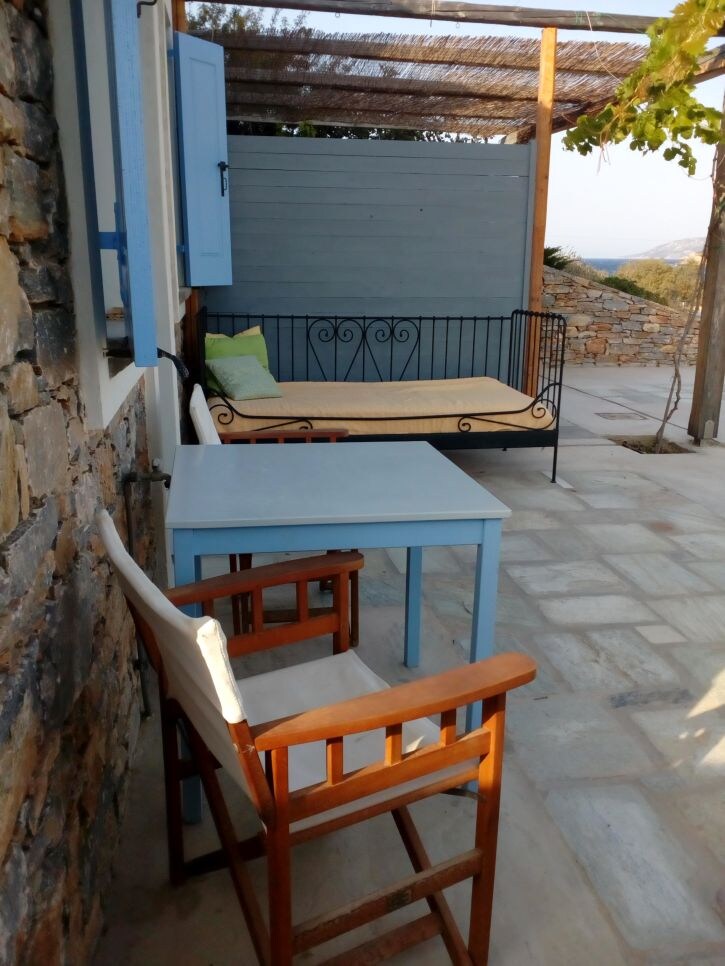 See on traditsiooniline Küklaidi esimese korruse elamu, iseseisev, oma suurte terrassidega, kust avaneb vaade merele ja imelistele päikeseloojangutele. See asub väga vaikses kohas, mis on külast kümne minuti jalutuskäigu kaugusel. (Tsementeeritud, valgustatud tee). Väliköök toiduvalmistamiseks ja suur kraanikauss väljas. Ühel terrassil on kaheinimesevoodi päevitamiseks või magamiseks tähtede all!!!!!!
