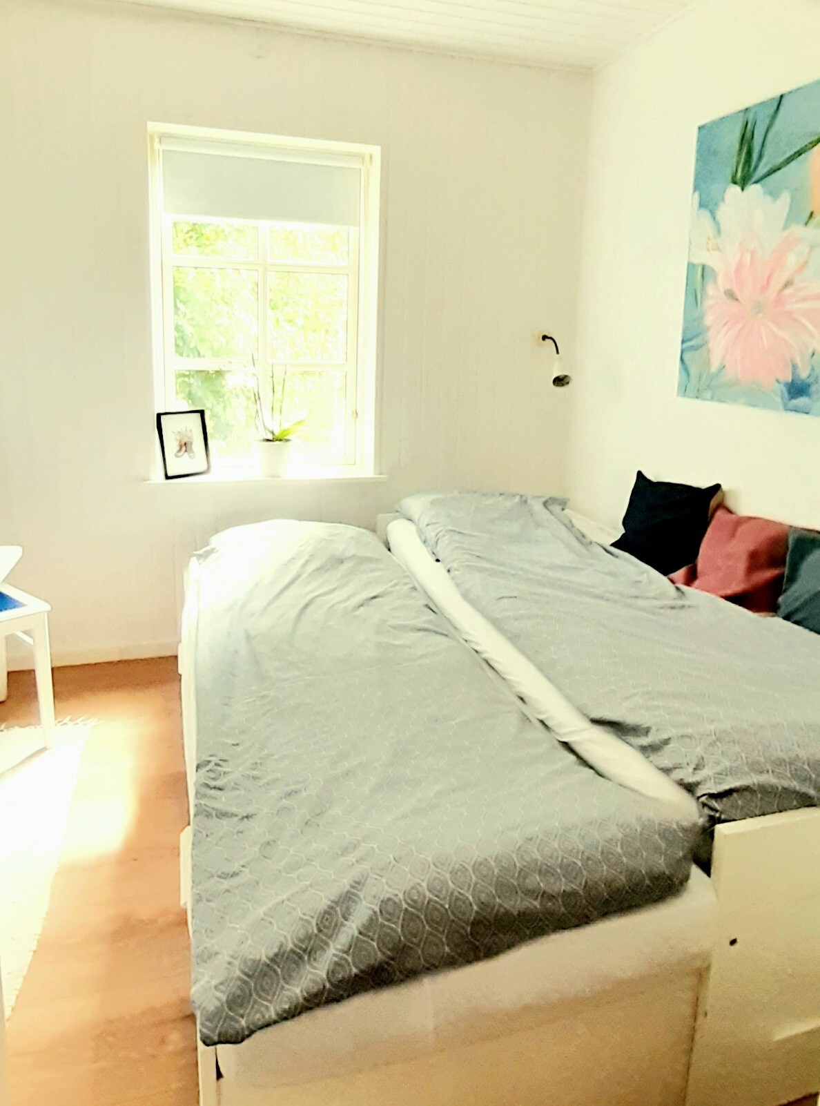Oleme veetnud palju aega renoveerides oma väikest puitmaja ringlussevõetamatute ehitusmaterjalidega, kaunistanud seda päranduste ja kirbutoitudega ning oleme nüüd valmis külaliste külastamiseks. Maja asub meie viljapuuaias, looduse, metsa, heade randade, keskaegsete linnade, Fuglsangi kunstimuuseumi lähedal ja mürast kaugel - välja arvatud meie vuttide ja vabapidamiskanad, mis võivad aeg-ajalt välja minna. Maja on 24 ruutmeetrit ja seal on ka loft, kus on piisavalt voodeid neljale inimesele.
