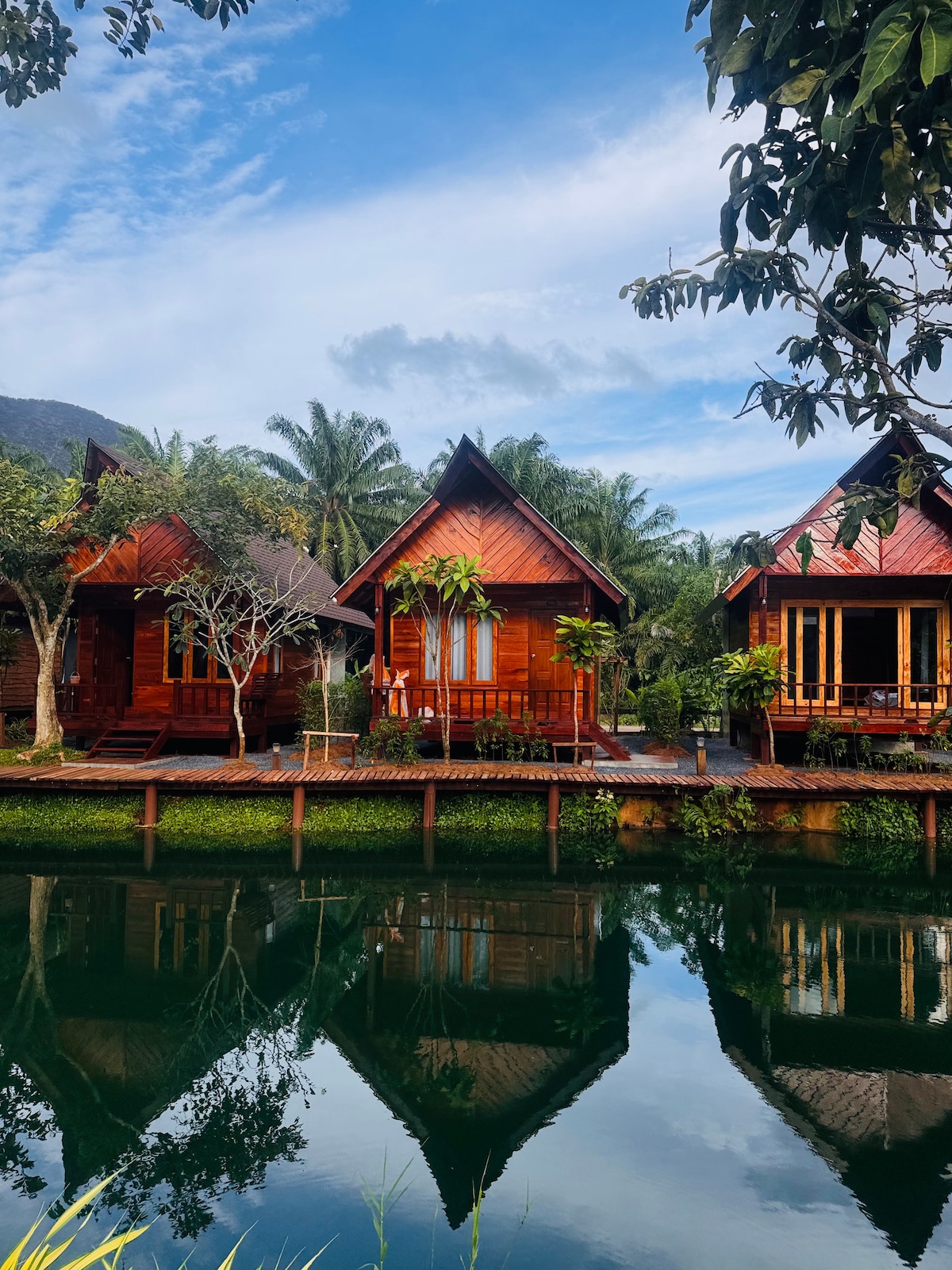 The bungalow is private (only one bungalow) with bathroom on-suite – it is built over a fish pond and adjacent to a beautiful creek and bird aviaries. It is situated in a semi-rural Thai farmstay / getaway with outdoor activities & sights such as – • Kayaking * • Cycling * • Fishing * • Swimming • Walking • Large vegetable garden • Free range domestic animals • Creek with fabulous swimming • Mountain views • Rural Thai activities eg rubber tapping Refer Ecovilla 2 adjacent hse appox 100m away