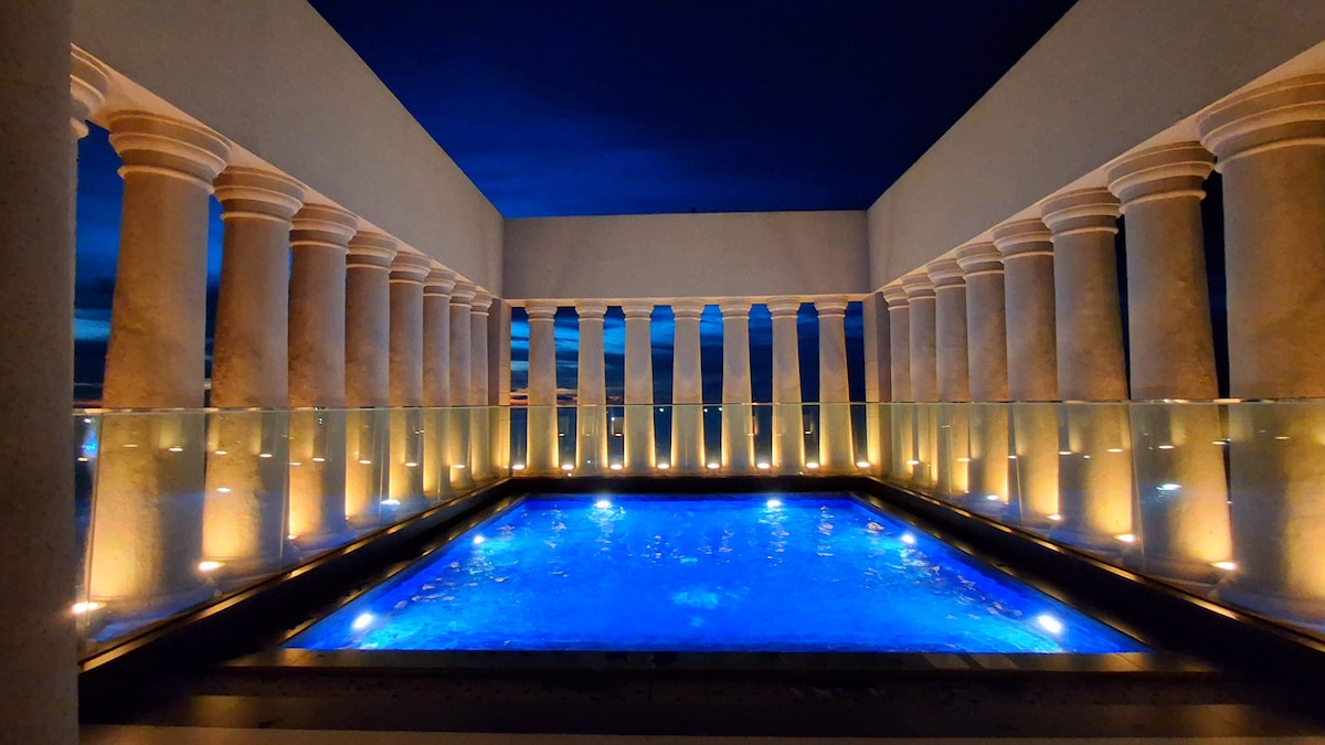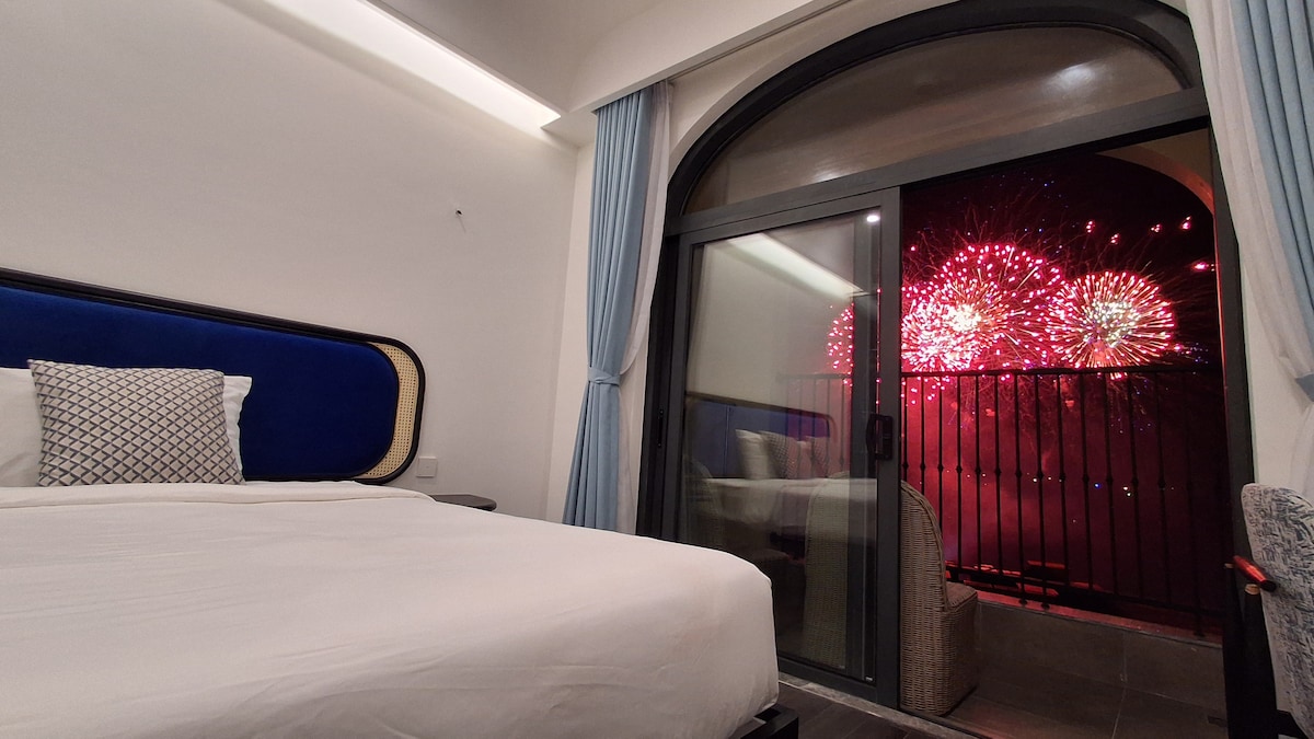 Kahe magamistoaga päikeseloojangulinn, merevaade, ilutulestik