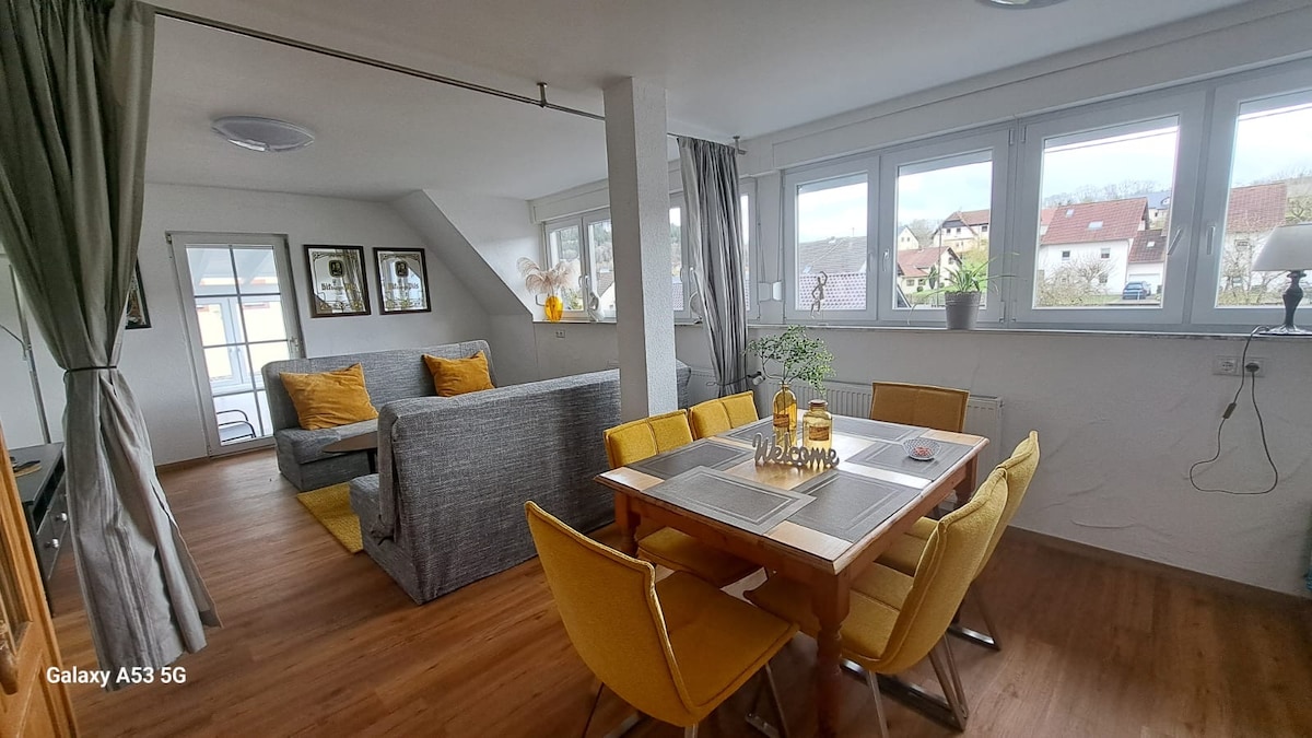 → 75 m ² korter → Erasaun → Vaade Gerolsteinile ja Dolomiitidele → Terrass hubase istumisalaga → Eifelsteig, matkarajad jalutuskäigu kaugusel → Garaaž jalgrataste ja mootorrataste jaoks → Suur elu- ja söögituba → Diivanvoodi → Täielikult varustatud köök → Saabumine nutiluku kaudu Soovituste → digitaalne teejuht → Nutiteler → Tasuta wifi → Väikelapse voodi