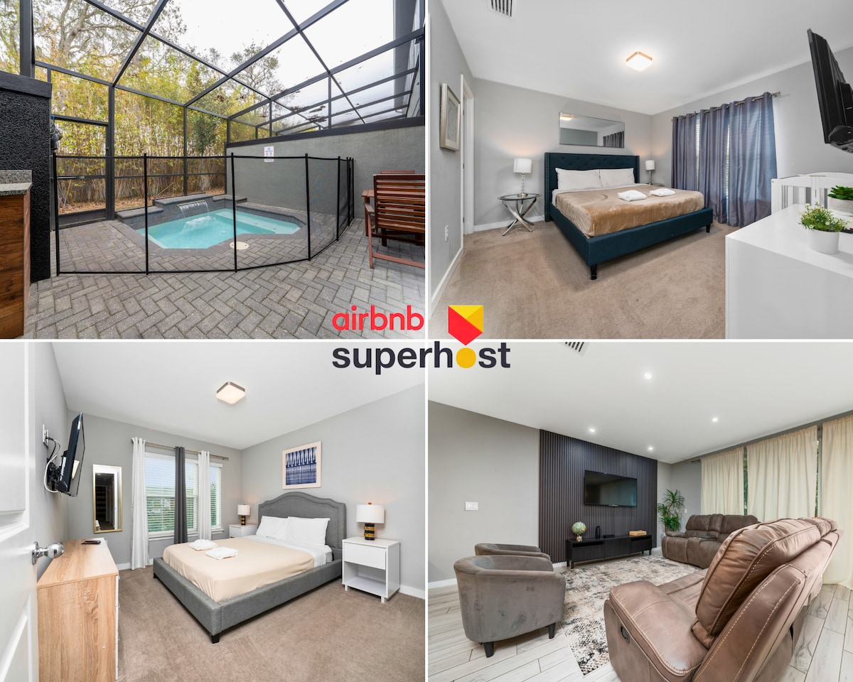 Avar 4BR-majutuskoht privaatse soojendusega basseiniga – 15 minuti kaugusel Disney 'st! Naudi suurt lõunapoolset basseini, propaangrilli, igas toas on Smart TV koos Disney+-ga. Nintendo Switch elutoas ja 85-tolline ekraan PS5-ga temperatuuriga reguleeritud garaažis / mängutoas. Kiire wifi, shuffleboard, piljardilaud ja palju lauamänge. Lõbu 🌴 vabas õhus Terrassikohad 14 + kahele puhketoolile. Propaangrill: 50 dollarit kogu peatumise ajaks Basseiniküte: 200 $ peatumise kohta (24-tunnine etteteatamisaeg)