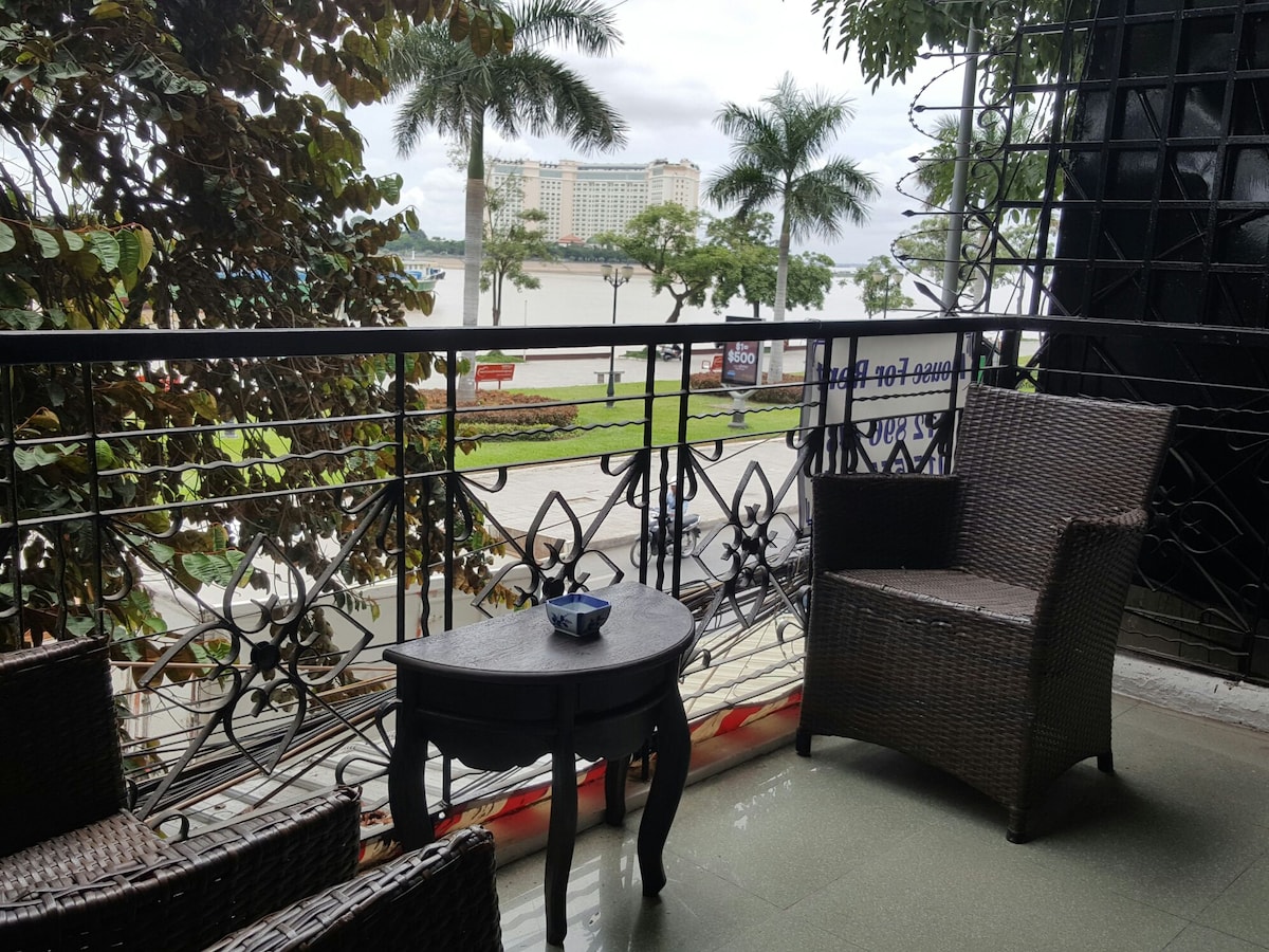 RIVERSIDE Central Apartment ( 64 m ² pluss rõdu ) ruutmeetrise rõduga otse TONLE SAP-i jõel. Ilus vaade, vaikne, esimesel korrusel. Sissepääs asub khmeri stiilis trepi taga ( jaga kolme teise naabriga). Kaunis kunstipäringuga, mis valmistab ette kõigi vajalike seadmetega. Ma elan ühel korrusel, kui vajad seda täiuslikku keskset asukohta PP, mõne minuti jalutuskäigu kaugusel kesklinnast, muuseumist, kuningalossist , Phnom Penhi mäest (linna sümbol) ja ööelust.
