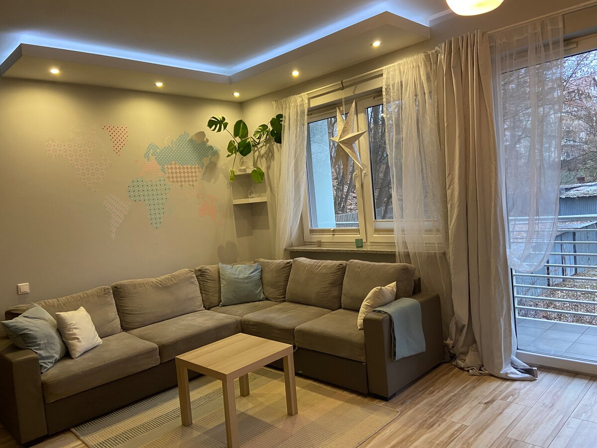 Mieszkanie, 1-pokojowe w wieżowcu z windą na 1 piętrze. Widok na zielony skwerek. Mieszkanie jest ciepłe, przytulne, słoneczne, w oldskulowym stylu. W pokoju jest dwuosobowe łóżko, biurko, fotel, TV. Kuchnia (kuchenka, mikrofala, lodówka, czajnik bezprzewodowy, naczynia) i łazienka po generalnym remoncie- kabina. Mieszkanie ma bardzo dobrą lokalizację. Przystanek autobusowy 3 min drogi. Dojazd do centrum (Galaxy, Kaskada) trwa 5 min. Blisko jest sklep i rynek Manhattan.