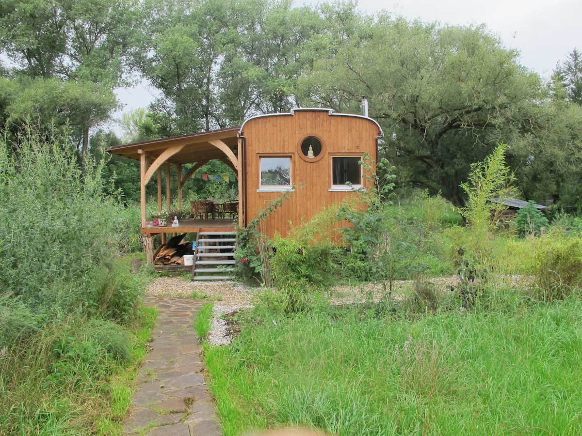 We rent out beautiful wooden-hemp natural house, with big "wild garden", surrounded by wild animals,. Just 35 minutes by train or car from Prague center. Located near the ancient castle Karlstejn. By hills, meadows and forest surrounded, river Berounka This make this place unique for relaxation, biking, hiking, getting to know Czech culture. Bikes are available for rent 150,-CZ/bike/day. Home sauna attached (for extra cost) to house keeps you relaxed and healthy. You ll simply love it.