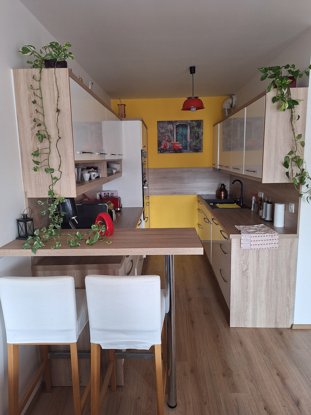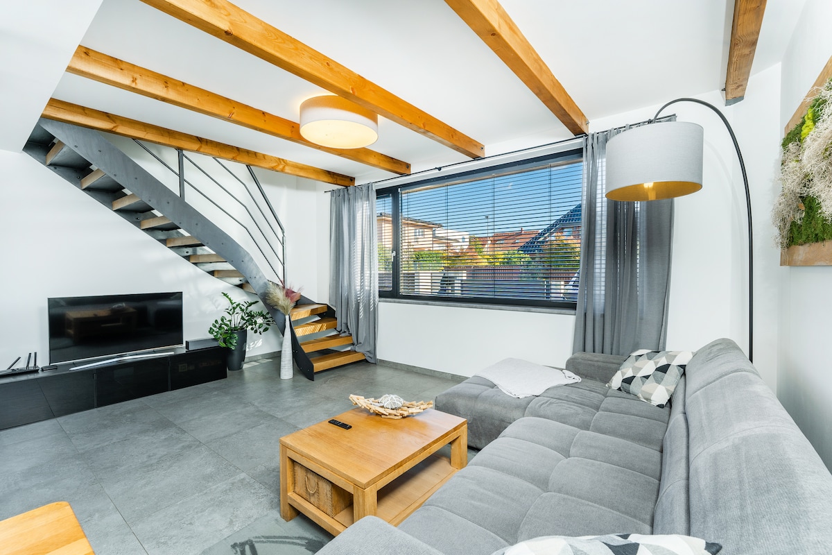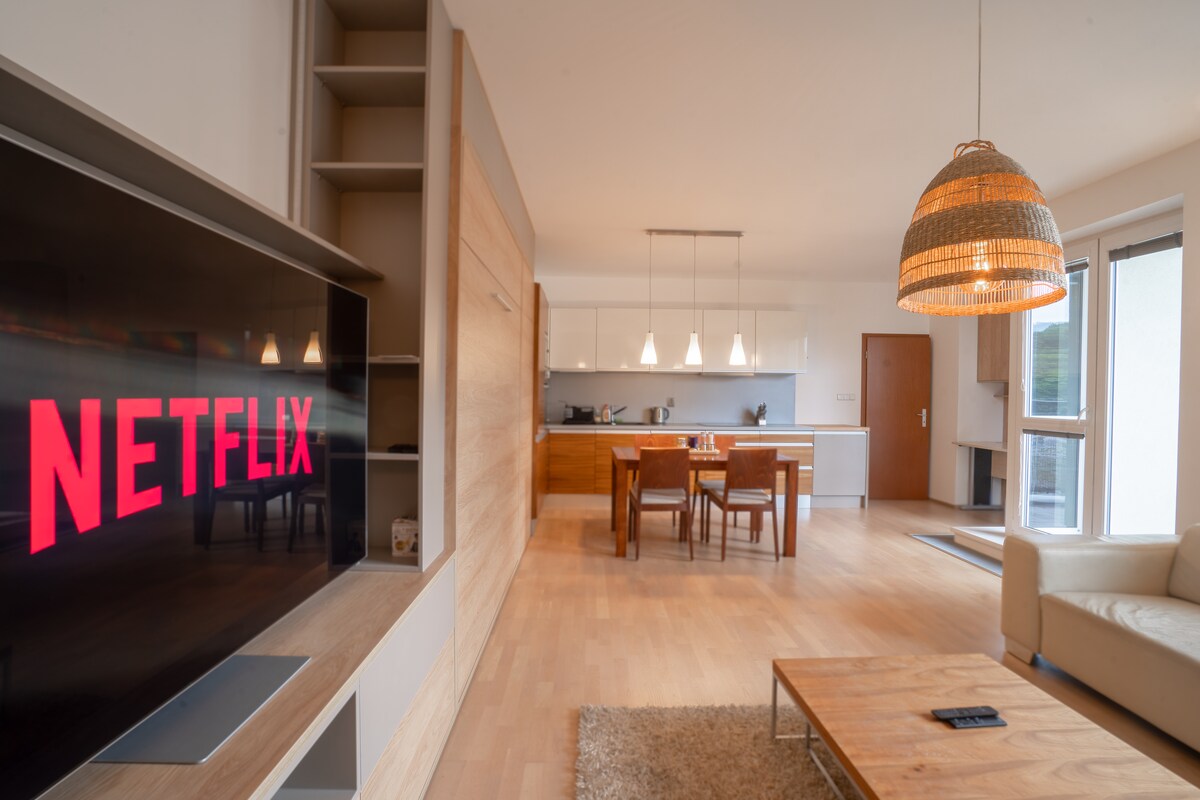 Malý moderní útulný byt s balkonem a projektorem s Netflixem. Byt se nachází v klidné čtvrti obklopený nádhernou přírodou. Byt není v centru, cesta do centra trvá cca 30 minut, doprava je ale dobře dostupná (autobus, vlak, tramvaj). Díky tomu je ale okolí bytu naprosto klidné a ideální na procházky do přírody, na dosah bytu je několik krásných přírodních míst. K bytu je zadarmo soukromé parkovací stání.