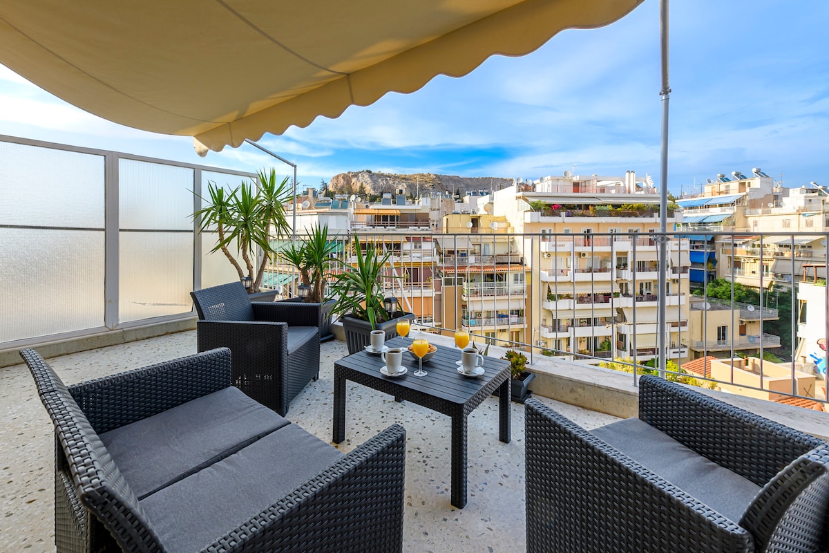 Täielikult renoveeritud valgusküllane loft on vaid 20 minuti jalutuskäigu kaugusel Akropolisest ja Akropolise muuseumist. Asub 7. korrusel ja on avar möbleeritud terrass, kust avaneb panoraamvaade Philopappou mäele ja Hymettose mägedele. Loft pakub kõike, mida vajad lühiajalise või pikaajalise majutuse nautimiseks Ateenas: täielikult varustatud köök, suur söögilaud, mida saab kasutada ka töökorras, mugavad pehmed toolid, nõudepesumasin, riidest pesumasin ja kuivati, lai kaheinimesevoodi anatoomilise madratsiga