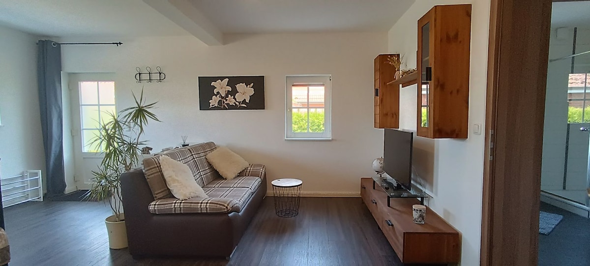 Armastavalt sisustatud 65 ruutmeetri suurune korter Westerrönfeldis ootab puhkusekülalisi, umbes 700 m kaugusel NOK-st, mis kutsub sind jalutama ja jalgrattasõitudele ookeani hiiglaste ja unistuste laevade ees. Meie eramaja esimesel korrusel asuvad magamistuba, elutuba, köök ja vannituba ning väiksem üheinimesevoodi magamistuba. Korter on hiljuti renoveeritud, varustatud elektrikatkestuse ruloode ja putukatõrjevahendiga. Seal on aiamaja kahele jalgrattale ja parkimiskoht teie autole