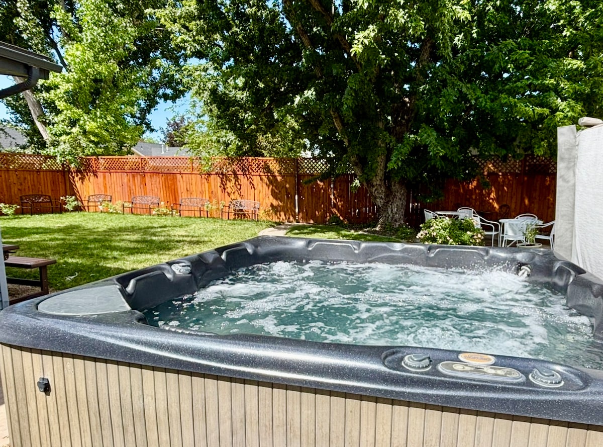 Noon checkout time, so you can sleep in before traveling! You will feel right at home at this two bedroom, family friendly home. Kitchen with oven, microwave, full size fridge, and large island. Entertain the family with two Roku TVs, board games, books, and yard games. Take a relaxing soak in the shared hot tub in the spacious backyard. Two bedrooms- 1 King w/ Tempur Pedic Mattress, 1 Queen, 2 Twin Beds, Pull-Out Couch, and crib. Peaceful, central location close to Roaring Springs and Wahooz.