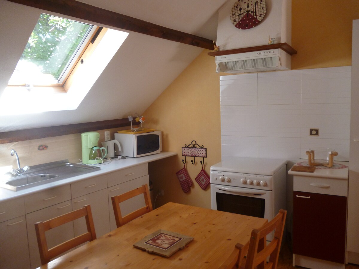 Vaikne 30 m2 mägisuvila meie maja kõrval, kuid iseseisev. Varustatud köök. Elektriline ahi/mikrolaineahi, klaasist pliidiplaat, Senseo, veekeetja, röster, raclette. Kinnine vannituba duši ja tualetiga. 1 magamistuba 140 cm voodiga. 15 minutit La Bourboule'ist. Mont-Dore 'i ja Chastreixi rajad 25 min. Kõik vajalikud poed Tauves 'is, 5 min autoga. Suvel naudi matkamist, aeda, kuhu sul on osaline juurdepääs. Privaatne kaetud terrass, grill, lamamistool. Vaikne õhtu ja ilus päikeseloojang