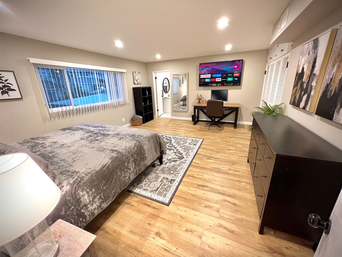 Privaatne puhkekoht oma sissepääsu ja parkimisega suletud kinnistul. 1 bdrm stuudiosviit spaaga, nagu vannituba ja miniköök. Queen bed w/ lounge area & garden patio retreat—unit is semi attached to the main home but fully private with separate entry/patio. *Kohvi-/teebaar *Tervitussnäkid on olemas *Joogamatt ja käte raskused * Kontaktivaba saabumine * Täiesti puhas Mugav SFValley asukoht mõne minuti kaugusel Van Nuys Flyaway jaamast LAX-i, Amtraki/metroojaamade ja kõigi kiirteede juurde.