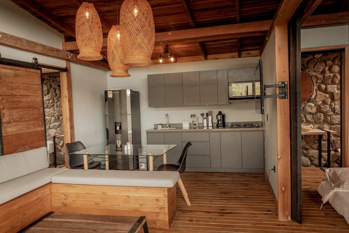 KUTSUME SIND MEIE LIHTSAT MAJAKEST PROOVIMA! Ümbritse end metsikus looduses ja mugavuses meie kaasaegses majakeses ilusas Jardin Antioquia külas. Oleme 8 minuti kaugusel peapargist, hotelli La Valdivia lähedal. Majutuskohas on jõgi, kus saab jahtuda ja hingata värsket õhku, 2 magamistuba, igas vannituba, esimeses magamistoas on 1 lai kaheinimesevoodi ja kaks üheinimesevoodit ning teises 2 kaheinimesevoodit ja 1 üheinimesevoodi. Meil on täielikult varustatud köök.