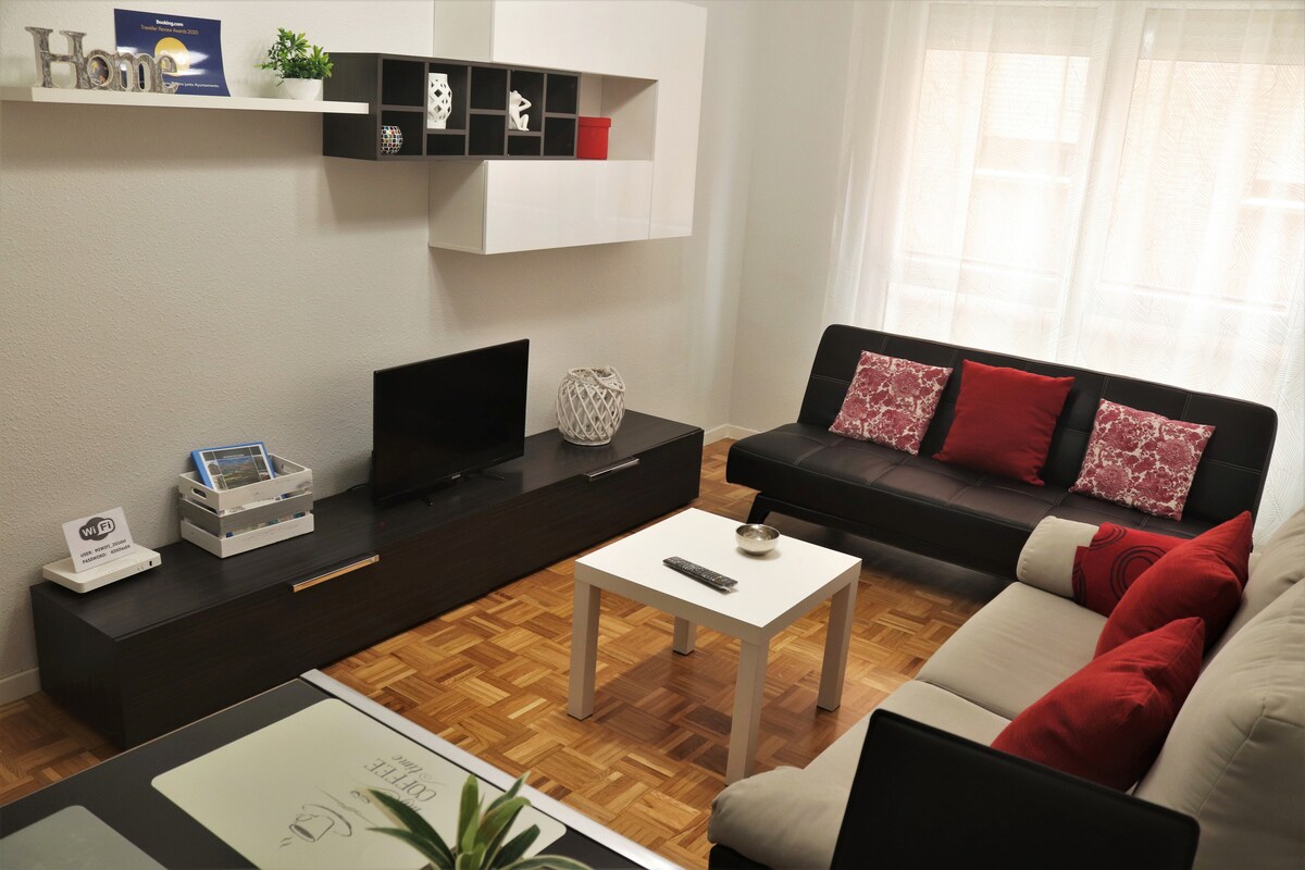Valgusküllane ja hubane korter Logroño kesklinnas, elegantsel tänaval Gran Vía, vanalinna ja Calle Laureli lähedal. Naudi keskust ilma pubimüra või hommikuste kelladeta. PAKKUMINE: TASUTA PARKIMINE ja HOMMIKUSÖÖK (saadaval, vt fotot). Renoveeritud, kõigi mugavustega: uued madratsid, 2 vannituba, avar elutuba, varustatud köök, WiFi ja teler kõigis tubades. Lahe; suvel laeventilaatorite ja teisaldatava kliimaseadmega.