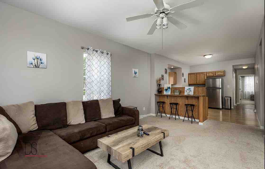 Kogu rühmal on sellest kesksest kohast hõlbus ligipääs kõigele. Mine meie paljudesse riigiparkidesse, sõida mööda Illinoisi jõge, ole seiklushimuline ja langevarjuhüpe Chicagos ja nimekiri jätkub. See kahe magamistoaga ühe vannitoaga maja tervitab sind kõigi mugavustega, et end koduselt tunda. Mahutab mugavalt 3 täiskasvanut. (1-Queen voodi ja 1 täissuuruses voodi) Seal on täielikult varustatud köök. pesumasin/kuivati ja väljas istumine/söögituba.