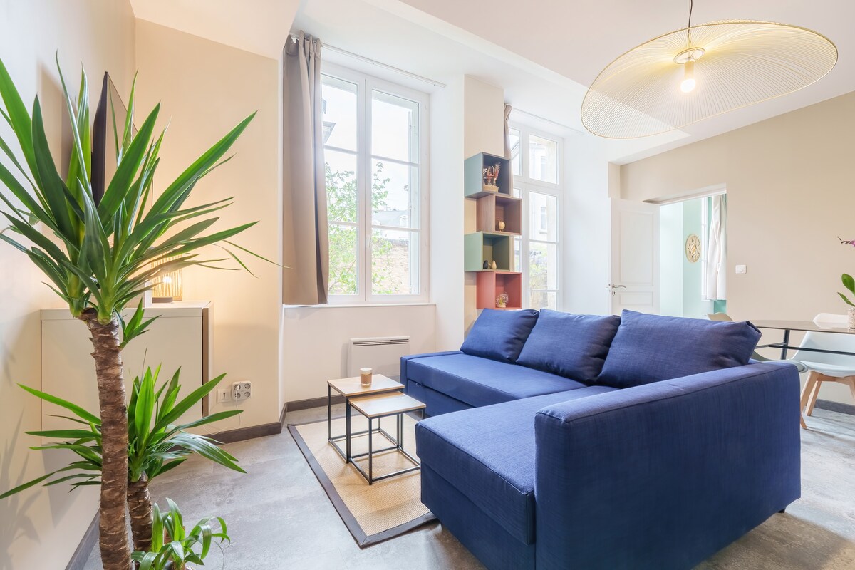 Soe majutus, 44m ², lõuna poole suunatud esimene korrus, päikesepaisteline ja varjutatud terrass. Ideaalne asukoht linna südames. Juurdepääs kõigile vaatamisväärsustele ja mugavustele. Vaid mõne minuti jalutuskäigu kaugusel rongijaamast. Parkimiskohad ees ja vahetus läheduses: tasuta 1 tund või kokku pärast kella 18.00 ja pühapäeval, püsiv 200 m kaugusel. - Voodi 160 X 200 - Dušš 120 x 80 - 50-tolline teler - Varustatud köök: elektripliit, õhupuhasti, ahi, mikrolaineahi, külmik-sügavkülmik, veekeetja, DolcéGusto kohvimasin, pesumasin - WiFi ja RJ45.
