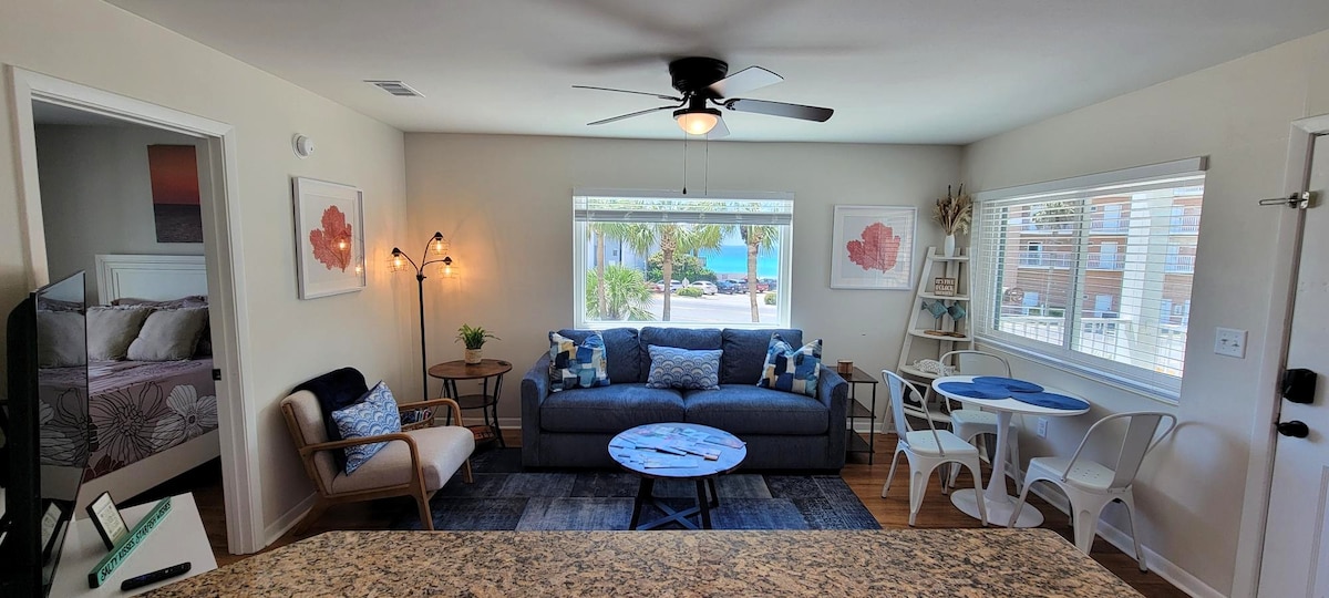Unwind in this centrally located & renovated studio condo. Our bright and breeze studio features a kitchenette, a comfortable lounging area & a selection of amenities. Our location puts you right in the heart of everything. Situated perfectly between Alys Beach and Rosemary Beach, you are just a 3-to-8-minute stroll from the most popular restaurants, boutique shopping, and the white sand. You can truly leave the car behind and walk everywhere. Best of all, at high tide, you can enjoy the serene