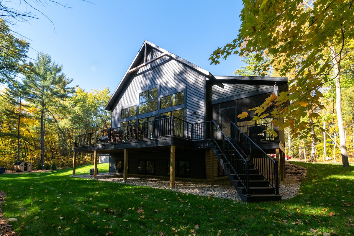 Lõõgastu mugavalt selles vapustavas moodsas majutuskohas. Kaunis metsane ümbrus, kust avaneb vaade majesteetlikele puudele ja interjööri voogab loomulik valgus. Lõõgastu hubase sise-/väliskamina juures ja lõbusta tagaterrassil grilliga, mullivanni ja tagahoovi lõkkeasemega. 3 magamistuba ja 2-1/2 vannituba ning hästi varustatud köök. Avar mängutuba köetavas garaažis. Põgene sellesse ainulaadsesse puhkekohta, mis on vaid mõne minuti kaugusel Saugatuckist, Michigani järve randadest ja Fenn Valley veinipiirkonnast. Koerasõbralik.