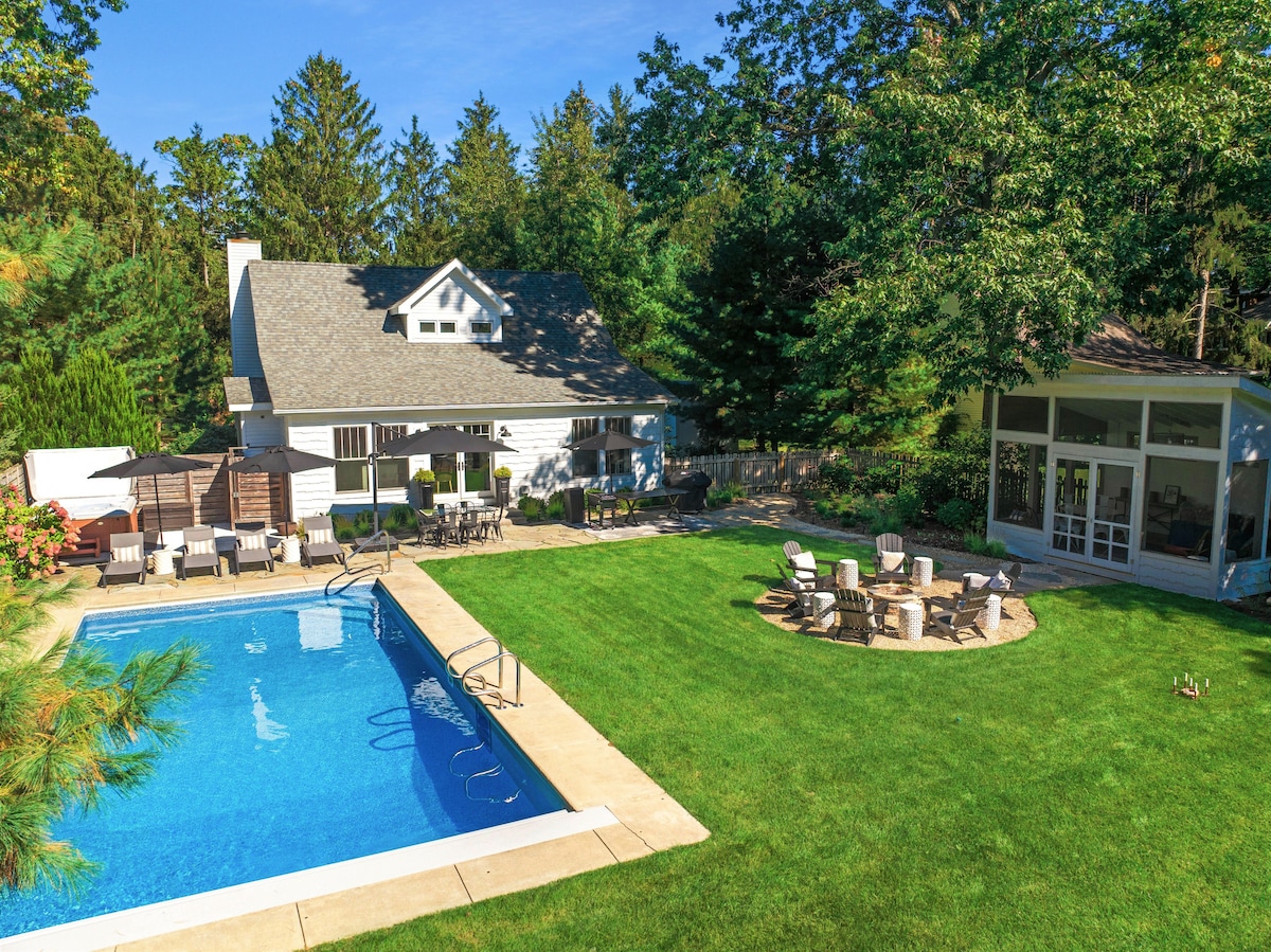 Sumptuous 4 BR/2.5 BA vacation home, just 1 block from Lake Michigan. Fully refurbished with reclaimed flooring, antique beams, custom doors, and fixtures. High-end kitchen, dining, and living areas with French windows. Living room features a stone fireplace, stylish couches, and a wide-screen TV. Three ground-floor bedrooms and baths with a second-floor bunk bed loft. Detached garage is a posh game room with high-end tables and a big TV. Covered patio, 4-seat dining, and bluestone courtyard.
